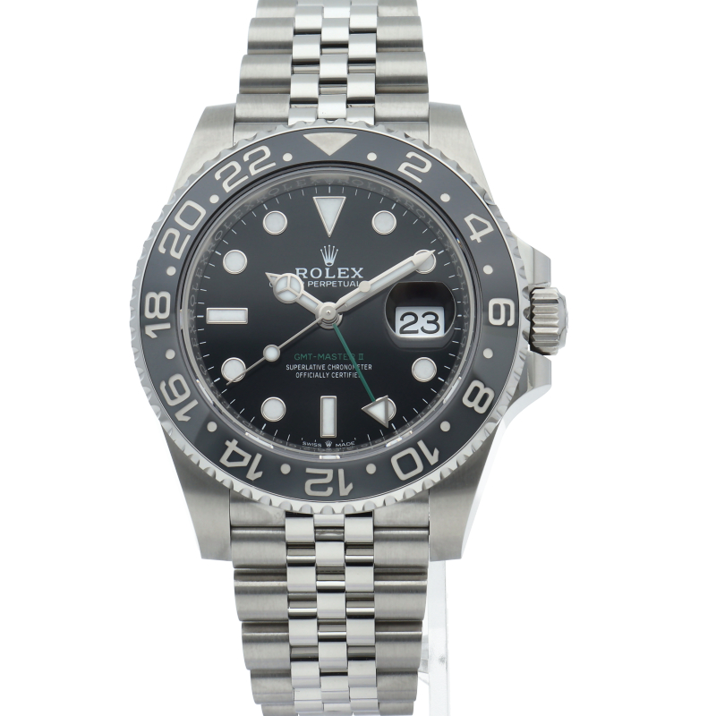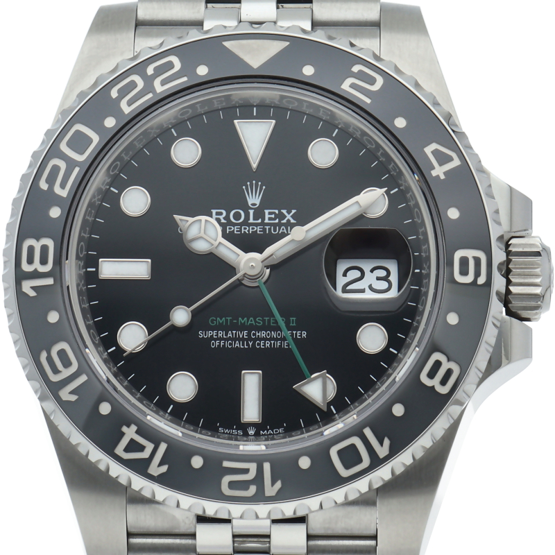 2024年に新たに加わった、グレー/ブラックベゼルにステンレスのケース/オイスターブレスレットの【126710GRNR GMTマスターII】。キャリバー3285はロレックスが特許を取得したクロナジーエスケープメントを採用し、高いエネルギー効率により70時間ものパワーリザーブを誇ります。