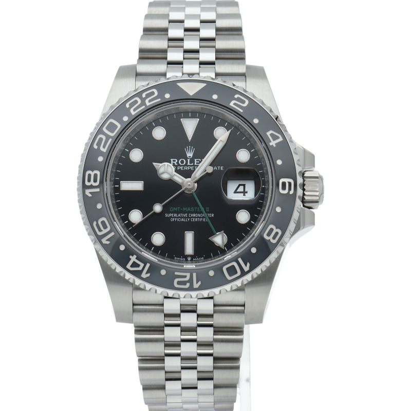 2024年に新たに加わった、グレー/ブラックベゼルにステンレスのケース/オイスターブレスレットの【126710GRNR GMTマスターII】。キャリバー3285はロレックスが特許を取得したクロナジーエスケープメントを採用し、高いエネルギー効率により70時間ものパワーリザーブを誇ります。
