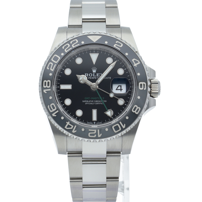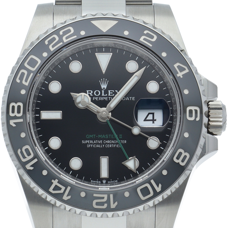 2024年に新たに加わった、グレー/ブラックベゼルにステンレスのケース/オイスターブレスレットの【126710GRNR GMTマスターII】。キャリバー3285はロレックスが特許を取得したクロナジーエスケープメントを採用し、高いエネルギー効率により70時間ものパワーリザーブを誇ります。