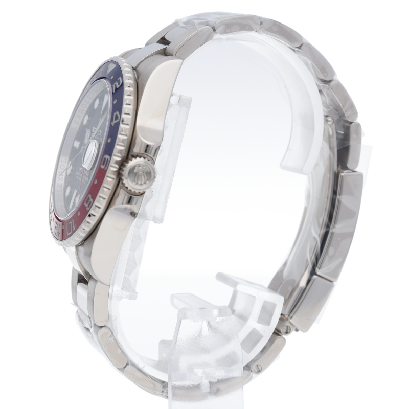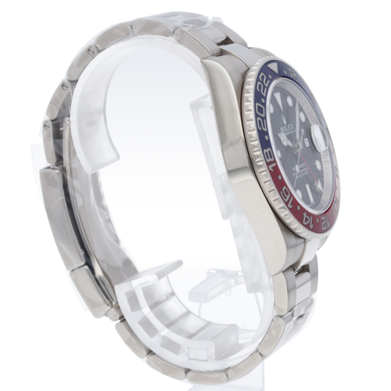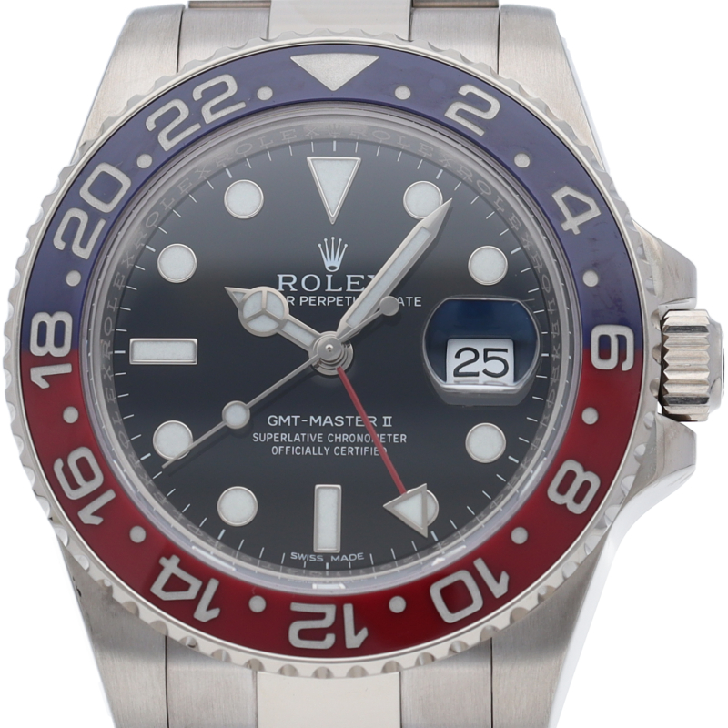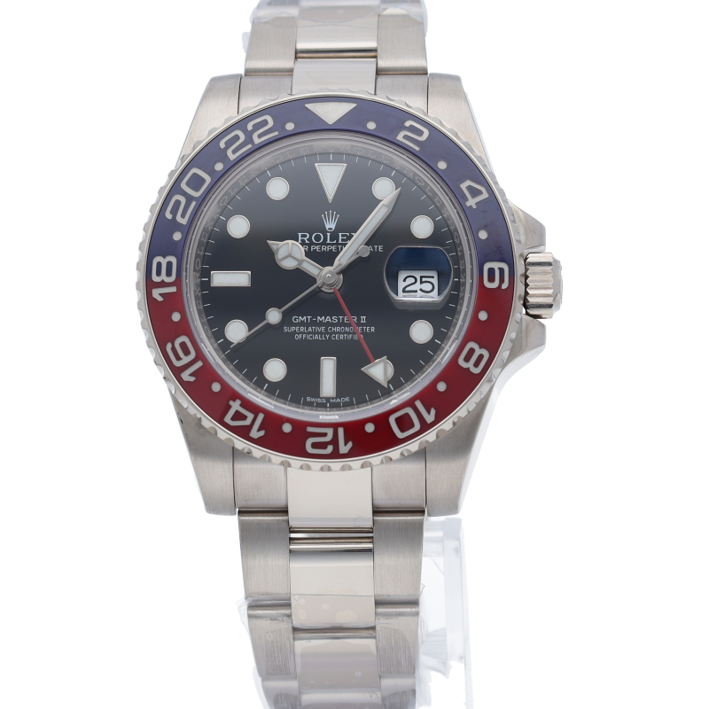 ロレックス人気モデル「GMTマスター2」。こちらは往年のGMTマスターを彷彿させるレッド&ブルーの2色に配色されたセラミック製ベゼルを採用、ホワイトゴールドケースに収められた存在感のある2014年発表モデルです。