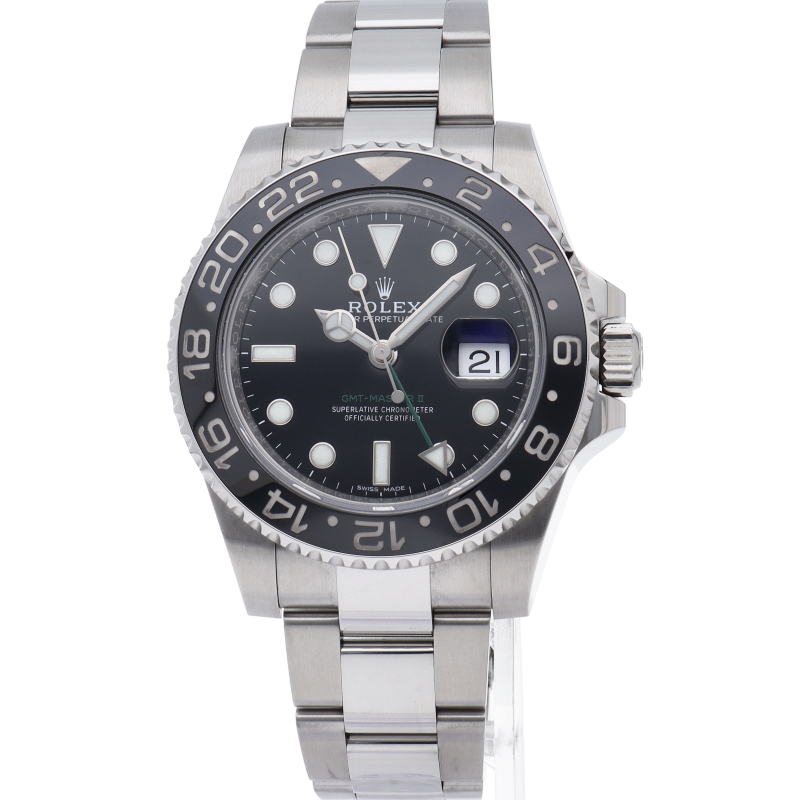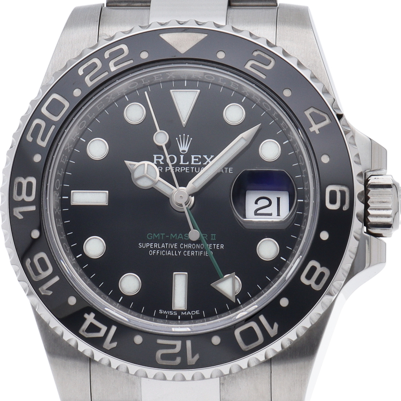ロレックス人気モデル「GMTマスター2」。2019年に生産が終了となったセラミックの黒ベゼルは実用性はもちろん、これからの相場が楽しみな1本です。