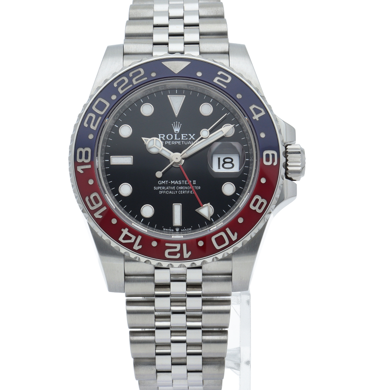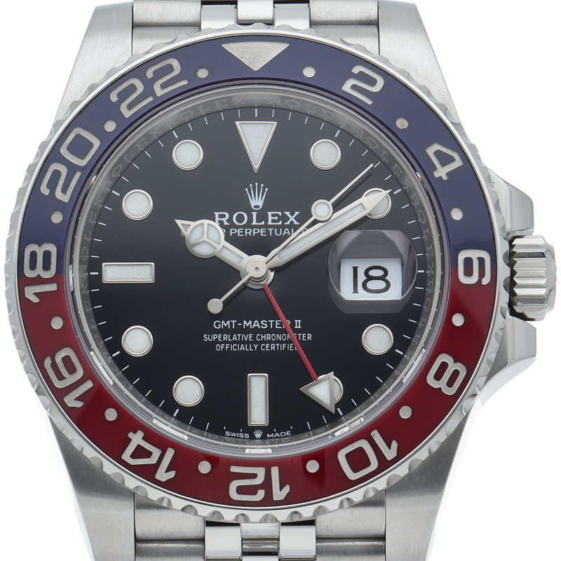 ロレックス人気モデル「GMTマスター2」のモデルチェンジした新型モデルです。セラミックベゼルにブレスやバックルも新しくなり高級感が更に増した1本です。