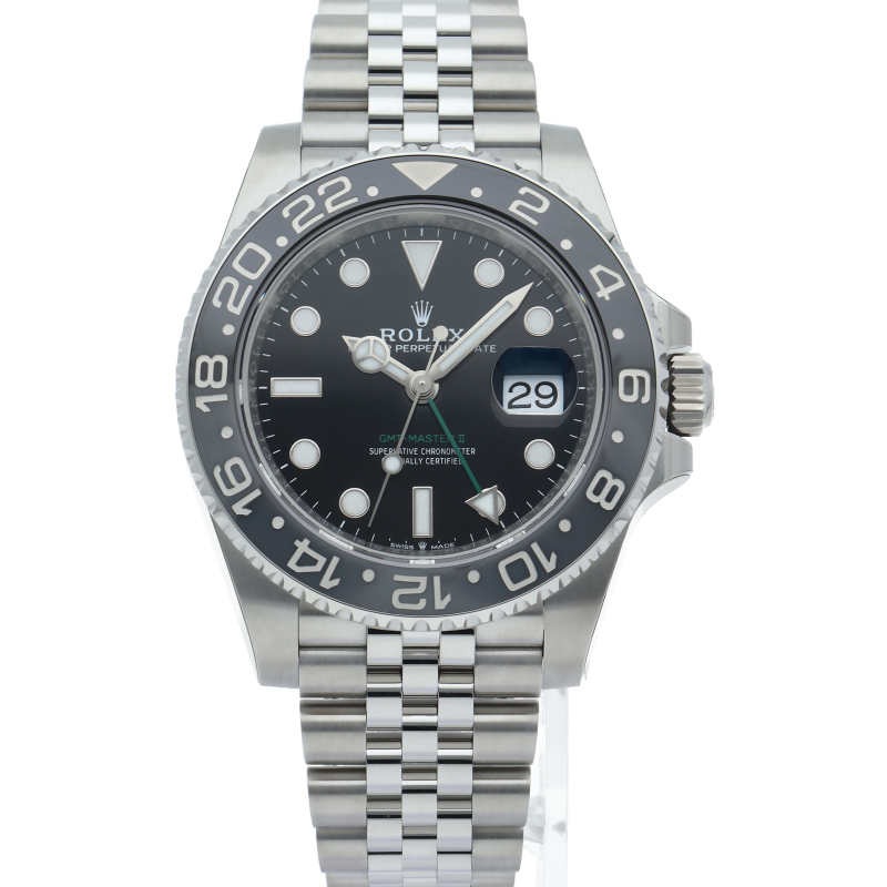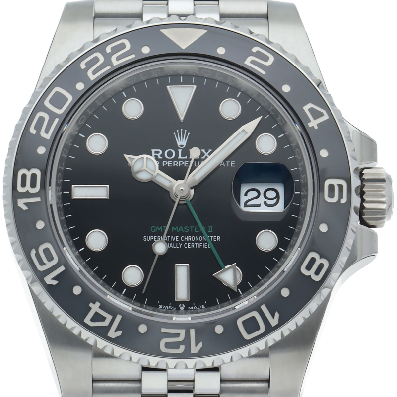 2024年に新たに加わった、グレー/ブラックベゼルにステンレスのケース/オイスターブレスレットの【126710GRNR GMTマスターII】。キャリバー3285はロレックスが特許を取得したクロナジーエスケープメントを採用し、高いエネルギー効率により70時間ものパワーリザーブを誇ります。