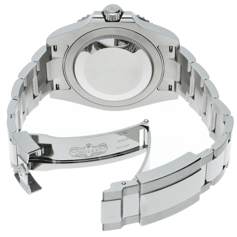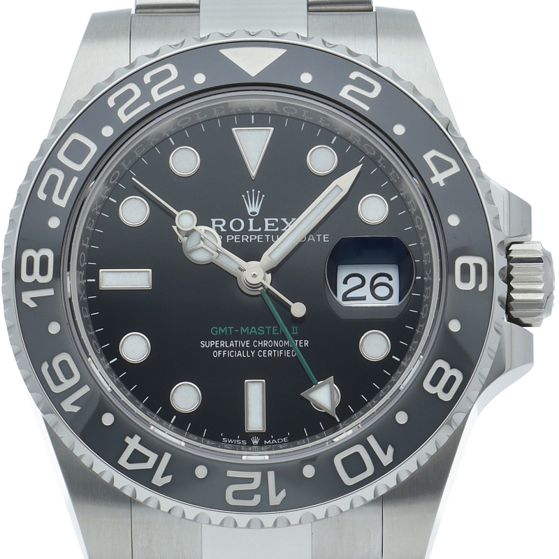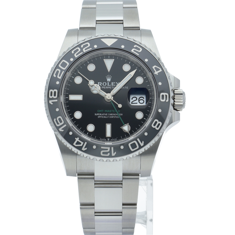 2024年に新たに加わった、グレー/ブラックベゼルにステンレスのケース/オイスターブレスレットの【126710GRNR GMTマスターII】。キャリバー3285はロレックスが特許を取得したクロナジーエスケープメントを採用し、高いエネルギー効率により70時間ものパワーリザーブを誇ります。