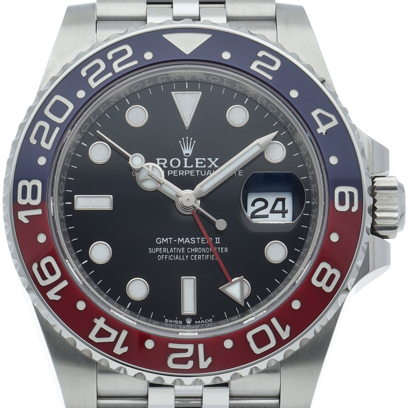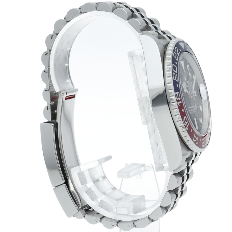 ロレックス人気モデル「GMTマスター2」のモデルチェンジした新型モデルです。セラミックベゼルにブレスやバックルも新しくなり高級感が更に増した1本です。