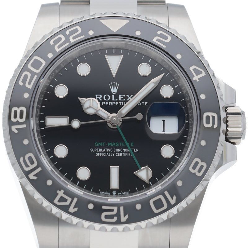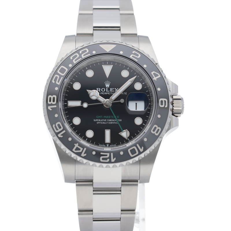 2024年に新たに加わった、グレー/ブラックベゼルにステンレスのケース/オイスターブレスレットの【126710GRNR GMTマスターII】。キャリバー3285はロレックスが特許を取得したクロナジーエスケープメントを採用し、高いエネルギー効率により70時間ものパワーリザーブを誇ります。