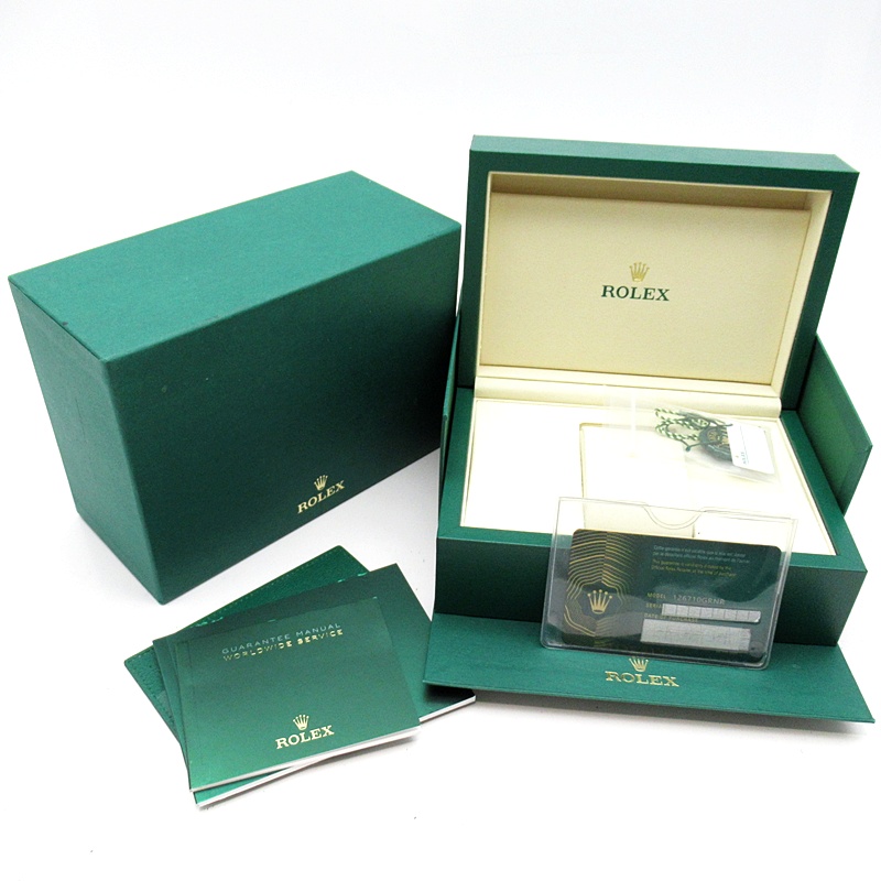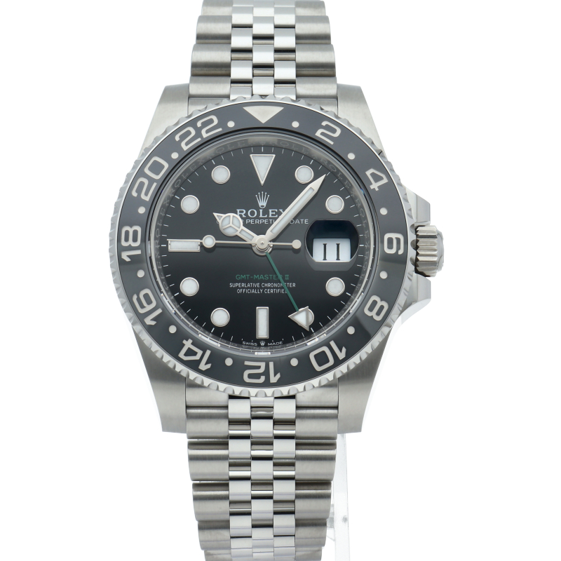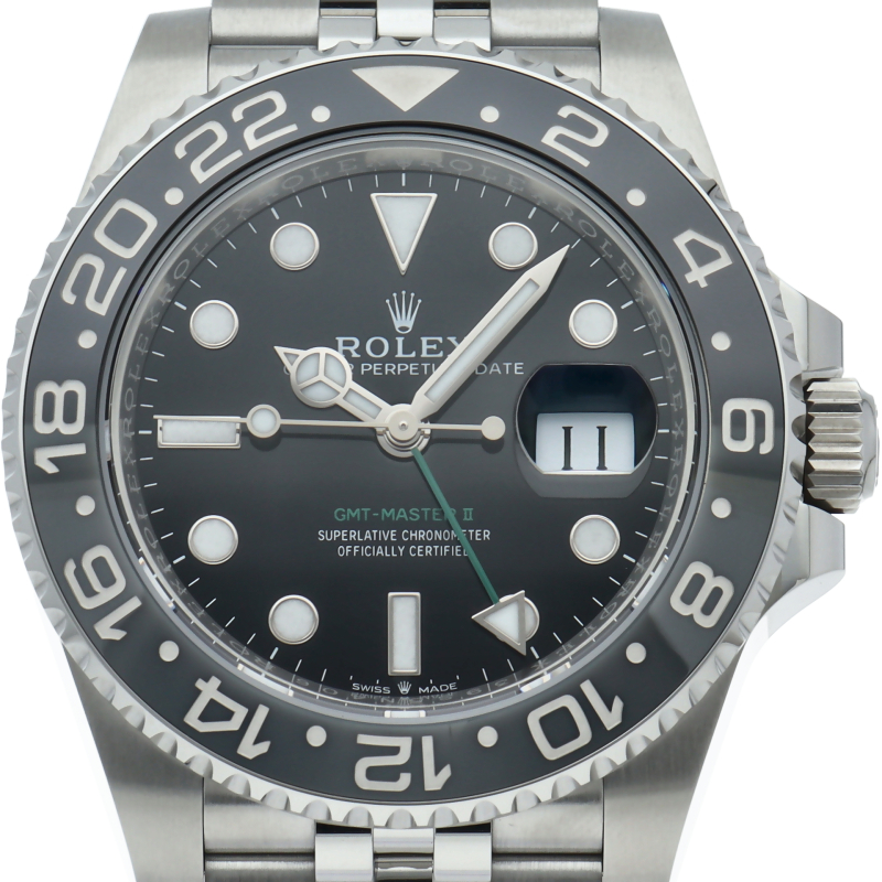 2024年に新たに加わった、グレー/ブラックベゼルにステンレスのケース/オイスターブレスレットの【126710GRNR GMTマスターII】。キャリバー3285はロレックスが特許を取得したクロナジーエスケープメントを採用し、高いエネルギー効率により70時間ものパワーリザーブを誇ります。