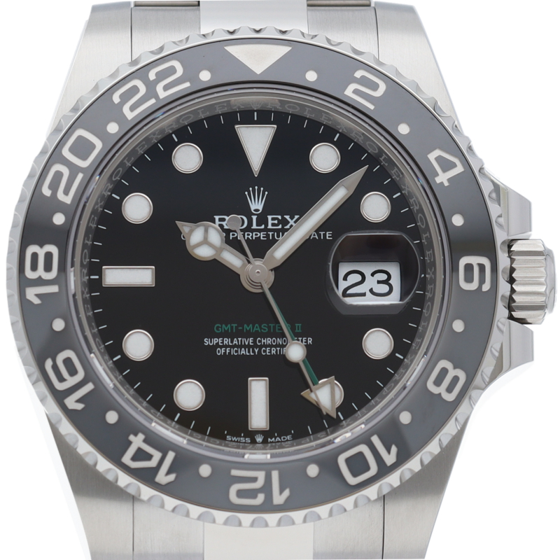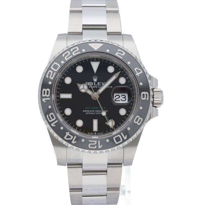 2024年に新たに加わった、グレー/ブラックベゼルにステンレスのケース/オイスターブレスレットの【126710GRNR GMTマスターII】。キャリバー3285はロレックスが特許を取得したクロナジーエスケープメントを採用し、高いエネルギー効率により70時間ものパワーリザーブを誇ります。
