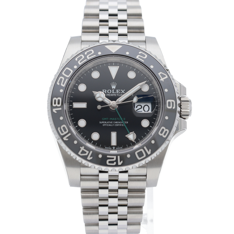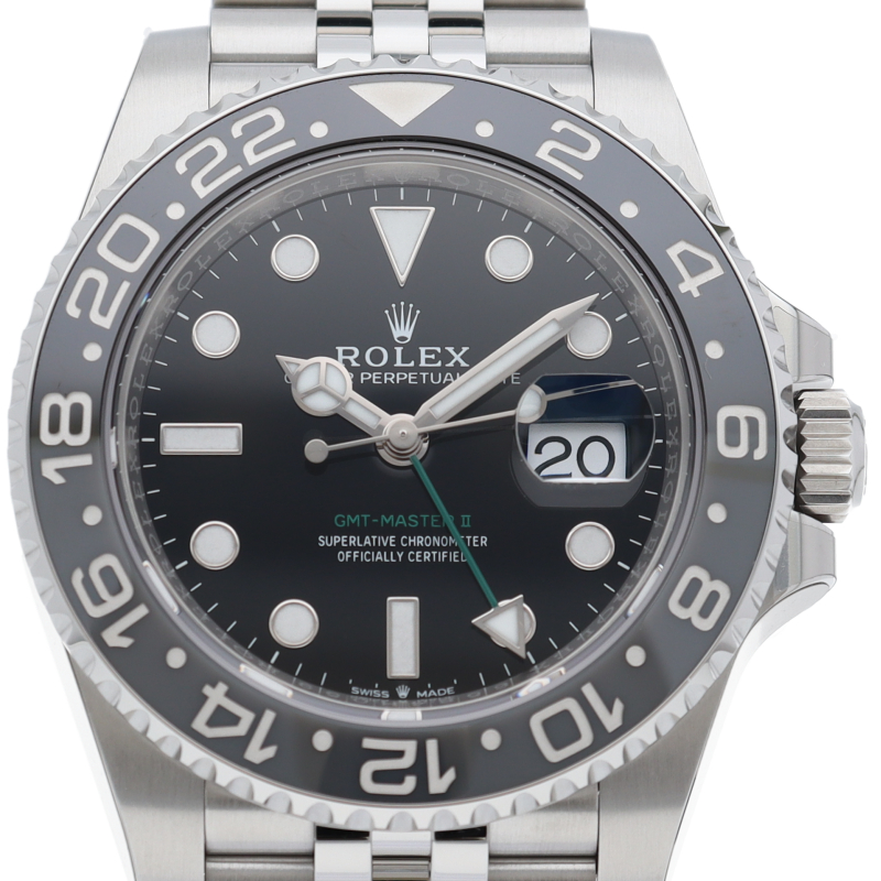 2024年に新たに加わった、グレー/ブラックベゼルにステンレスのケース/オイスターブレスレットの【126710GRNR GMTマスターII】。キャリバー3285はロレックスが特許を取得したクロナジーエスケープメントを採用し、高いエネルギー効率により70時間ものパワーリザーブを誇ります。