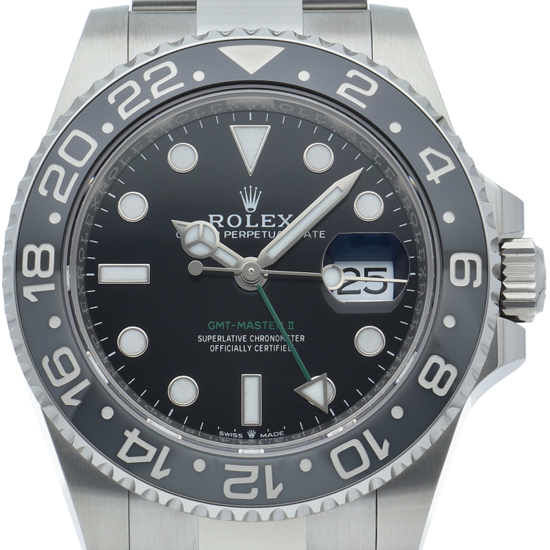2024年に新たに加わった、グレー/ブラックベゼルにステンレスのケース/オイスターブレスレットの【126710GRNR GMTマスターII】。キャリバー3285はロレックスが特許を取得したクロナジーエスケープメントを採用し、高いエネルギー効率により70時間ものパワーリザーブを誇ります。