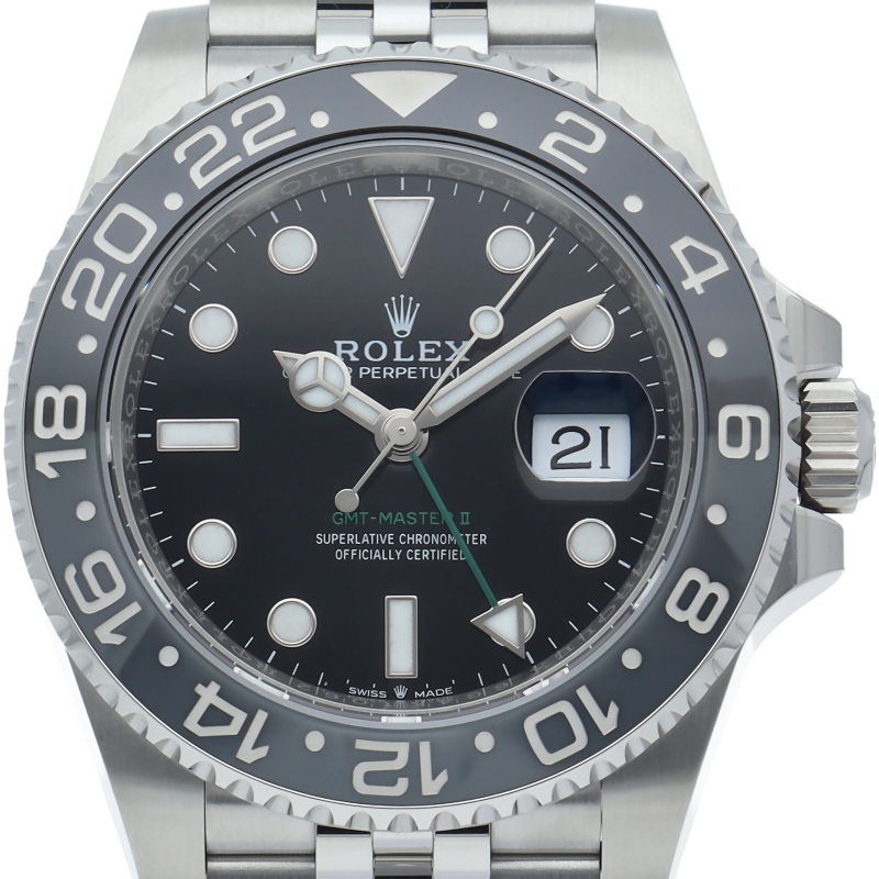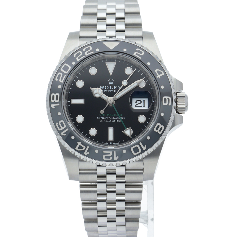 2024年に新たに加わった、グレー/ブラックベゼルにステンレスのケース/オイスターブレスレットの【126710GRNR GMTマスターII】。キャリバー3285はロレックスが特許を取得したクロナジーエスケープメントを採用し、高いエネルギー効率により70時間ものパワーリザーブを誇ります。
