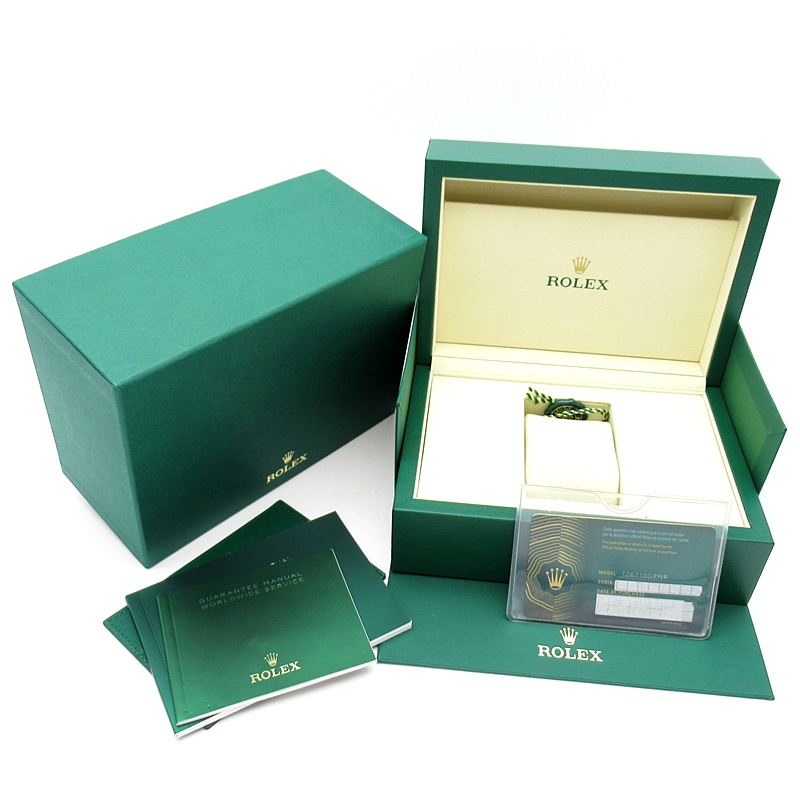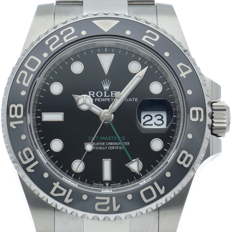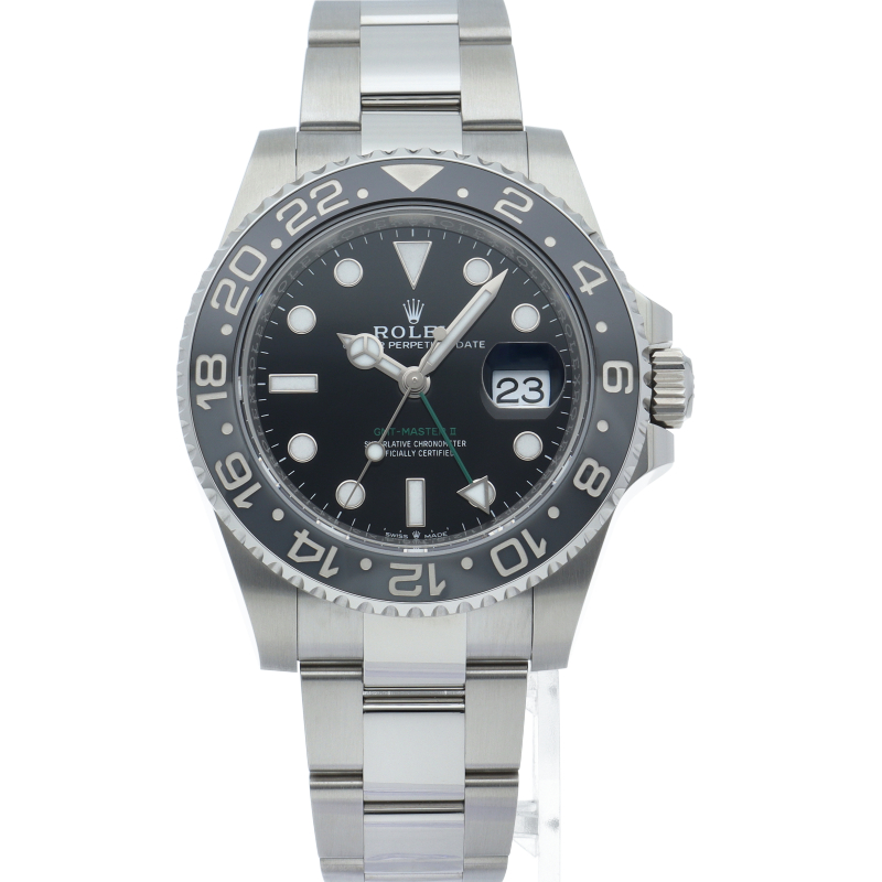 2024年に新たに加わった、グレー/ブラックベゼルにステンレスのケース/オイスターブレスレットの【126710GRNR GMTマスターII】。キャリバー3285はロレックスが特許を取得したクロナジーエスケープメントを採用し、高いエネルギー効率により70時間ものパワーリザーブを誇ります。