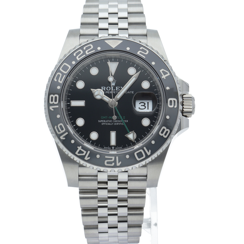 2024年に新たに加わった、グレー/ブラックベゼルにステンレスのケース/オイスターブレスレットの【126710GRNR GMTマスターII】。キャリバー3285はロレックスが特許を取得したクロナジーエスケープメントを採用し、高いエネルギー効率により70時間ものパワーリザーブを誇ります。