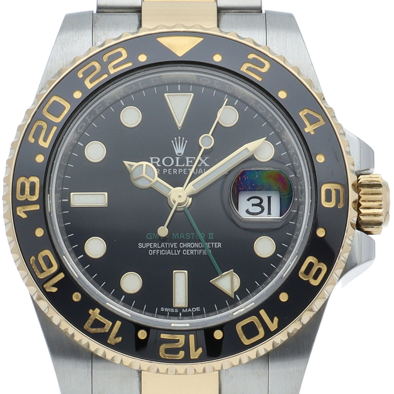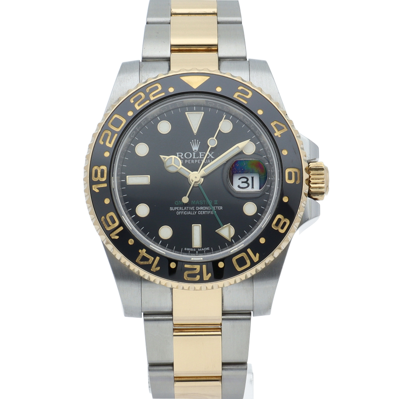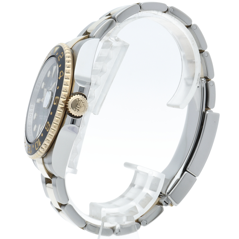 ロレックス人気モデル「GMTマスター2」のモデルチェンジにともない生産終了となった116713LNです。ワンランク上のイエローゴールド仕様のコンビモデルです。