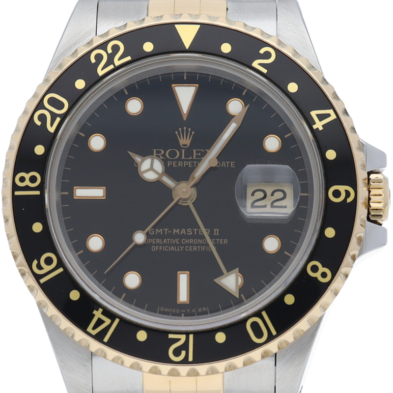 GMTマスター2のモデルチェンジにともない生産終了となった「16713」。今でも根強い人気と安定した相場が魅力です。便利なGMT機能付で実用性の高い1本。高級感溢れるコンビモデルです。黒ベゼル。