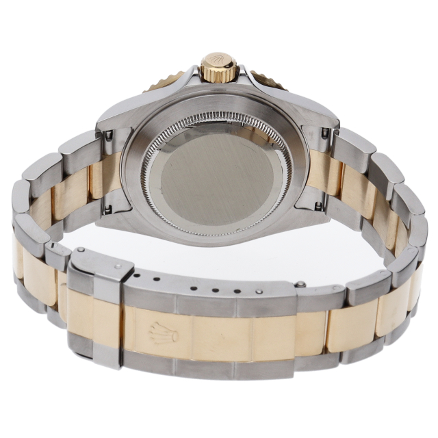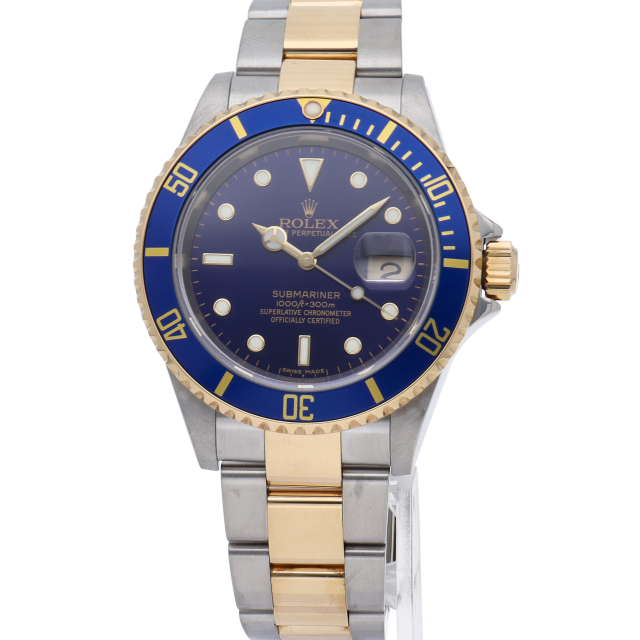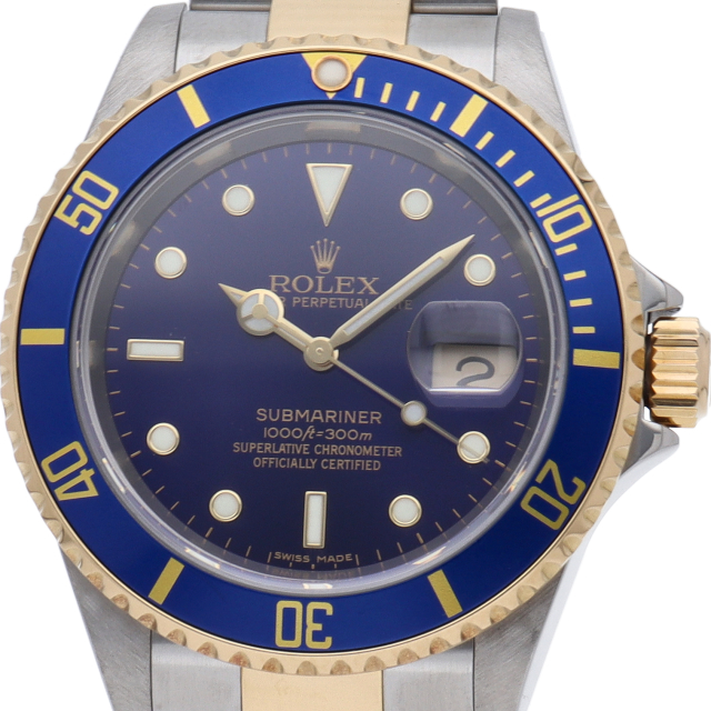 ロレックスの中でも特に人気度の高い「サブマリーナ・デイト」。イエローゴールドとステンレスのコンビモデルで高級感溢れる1本。通称「青サブ」。