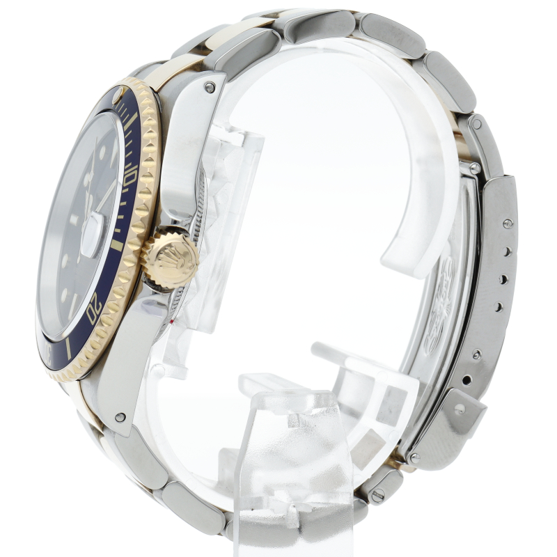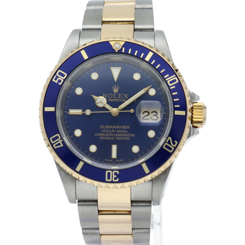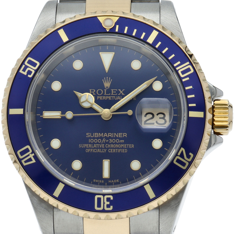 ロレックスの中でも特に人気度の高い「サブマリーナ・デイト」。イエローゴールドとステンレスのコンビモデルで高級感溢れる1本。通称「青サブ」。
