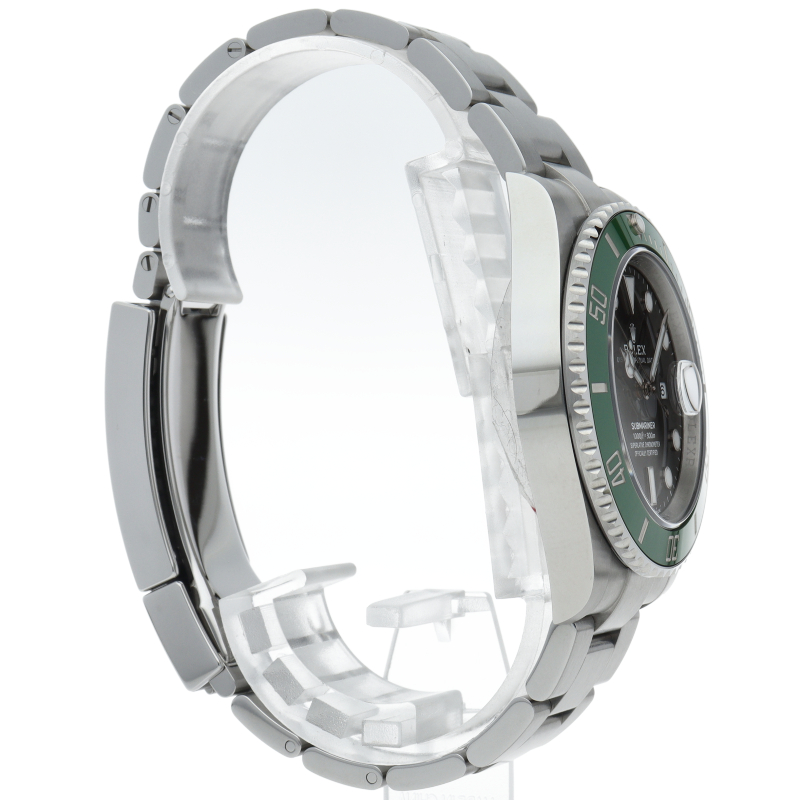 2003年にサブマリーナ誕生50周年記念として発表され高い人気を誇る“グリーンサブマリーナ”が新型自社ムーブメントを搭載しモデルチェンジしました。ブランドカラーであるグリーンのセラミックベゼルはそのままに文字盤がブラックになりました。ケースサイズは前作より1mm大きい41mmとなります。