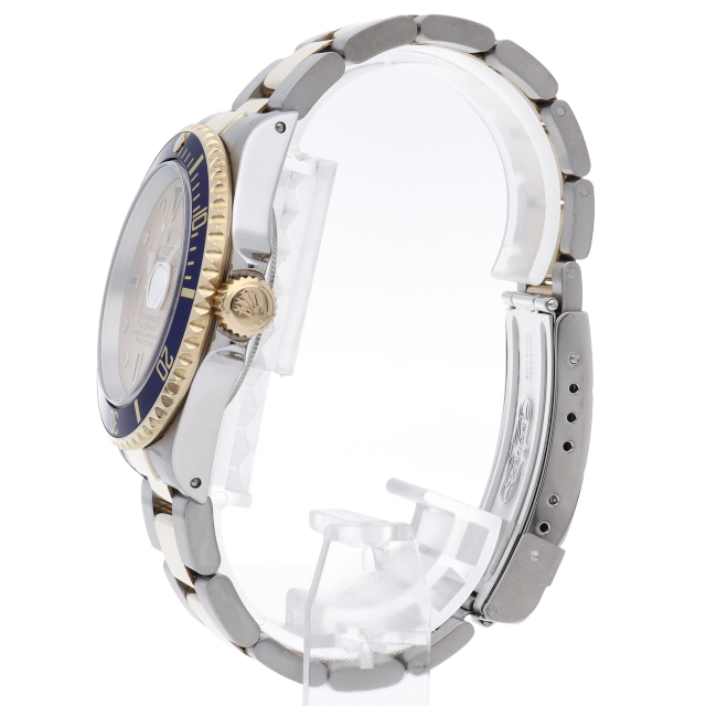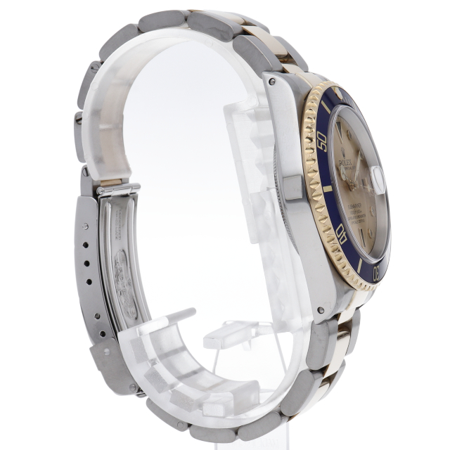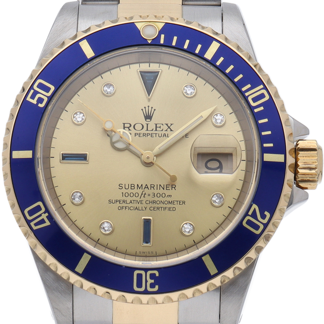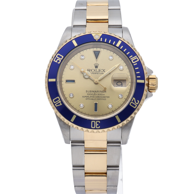 ロレックスの中でも特に人気度の高い「サブマリーナ・デイト」のイエローゴールドとステンレスのコンビモデルで文字盤に8Pダイヤ・3Pサファイアが施された高級感溢れる1本。