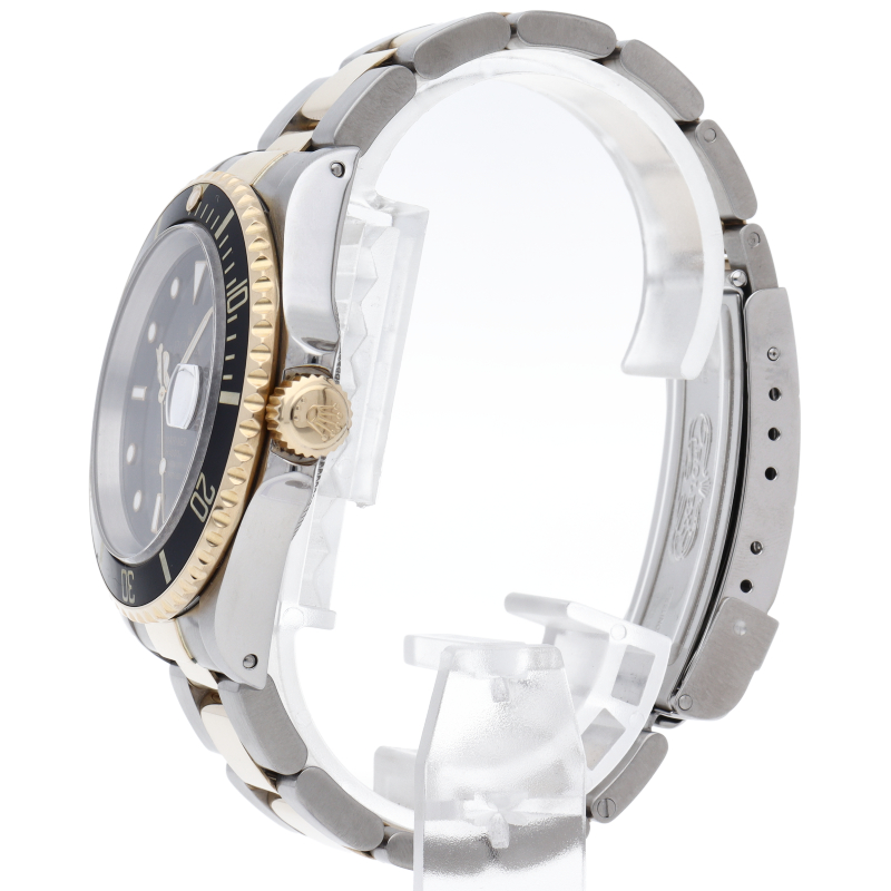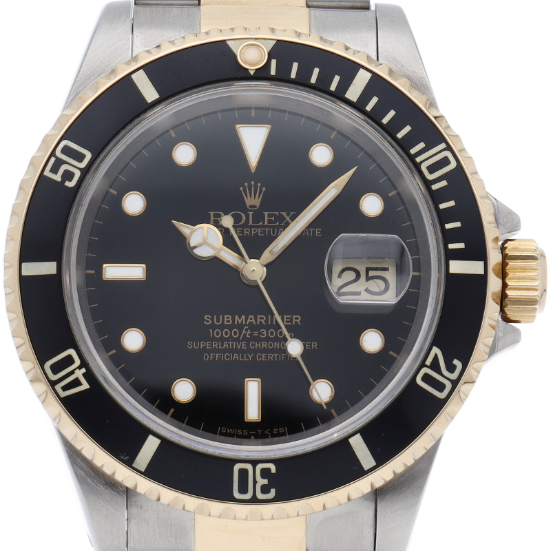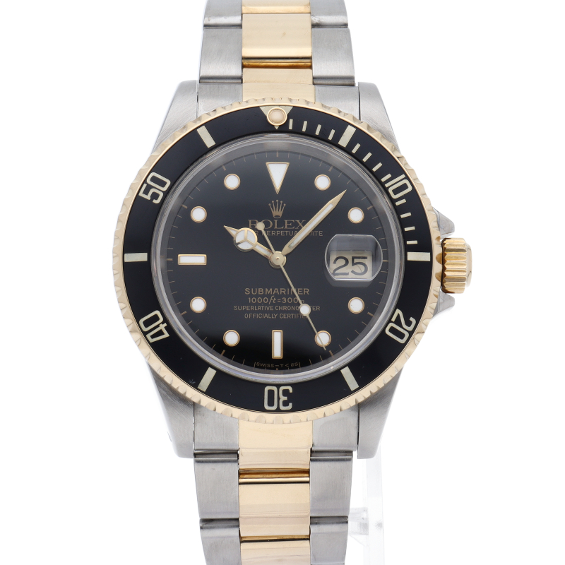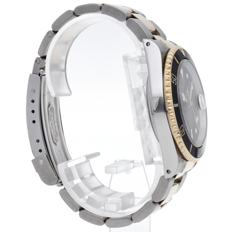 ロレックスの中でも特に人気度の高い「サブマリーナ・デイト」。イエローゴールドとステンレスのコンビモデルで高級感溢れる1本。通称「黒サブ」。