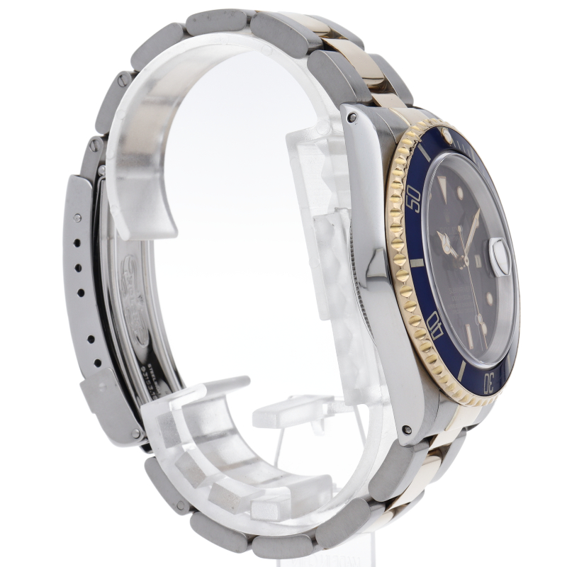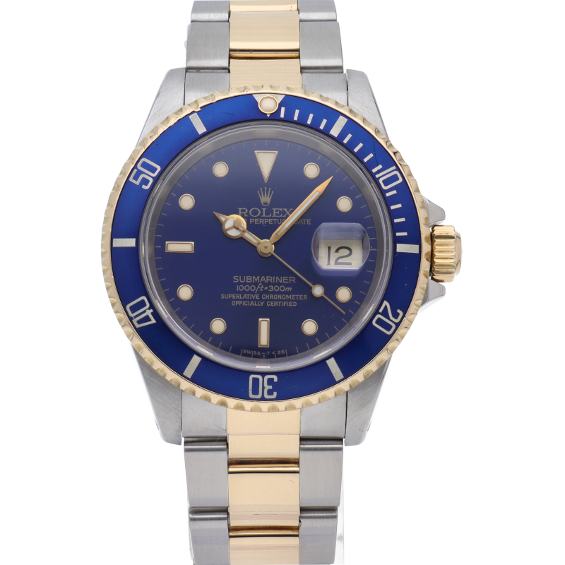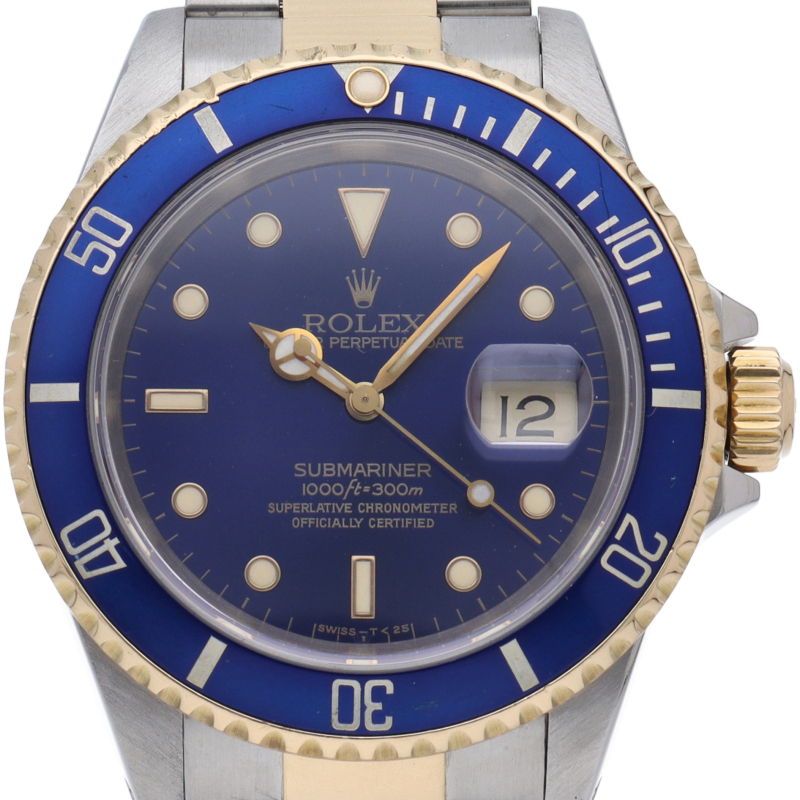 ロレックスの中でも特に人気度の高い「サブマリーナ・デイト」。イエローゴールドとステンレスのコンビモデルで高級感溢れる1本。通称「青サブ」。
