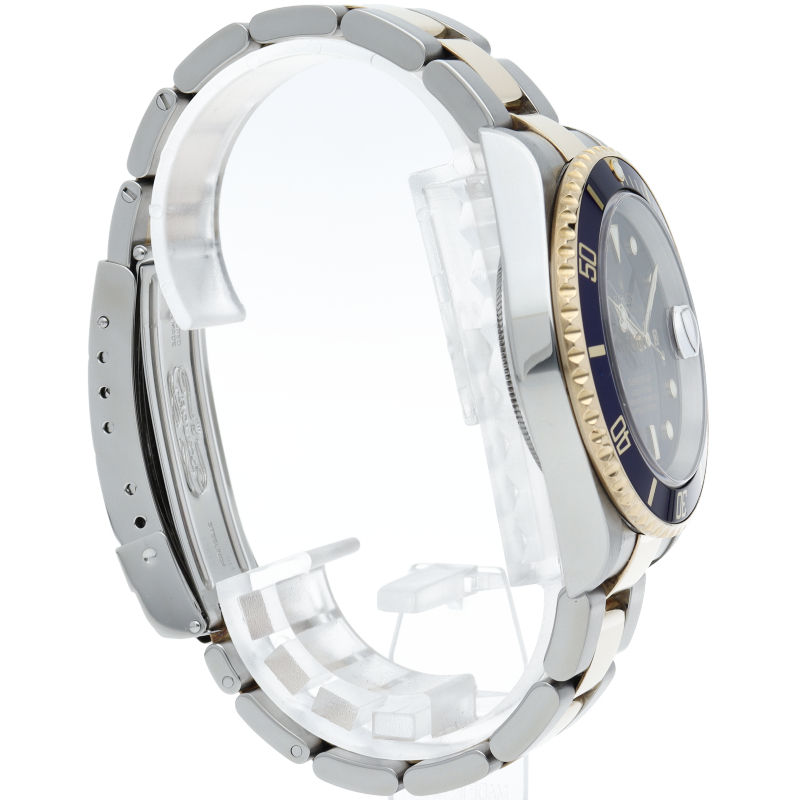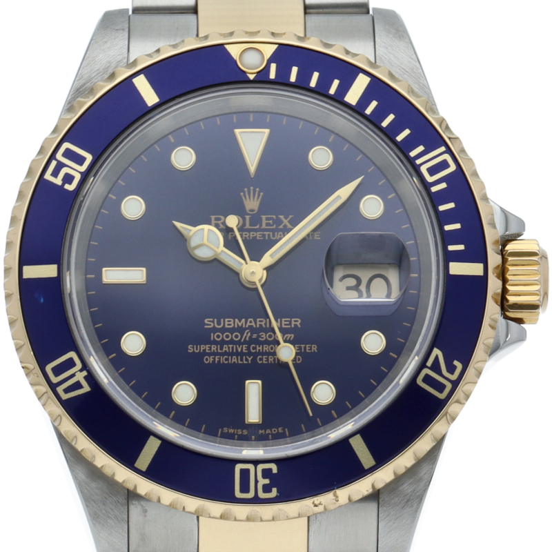 ロレックスの中でも特に人気度の高い「サブマリーナ・デイト」のイエローゴールドとステンレスのコンビモデルで高級感溢れる1本。通称「青サブ」。