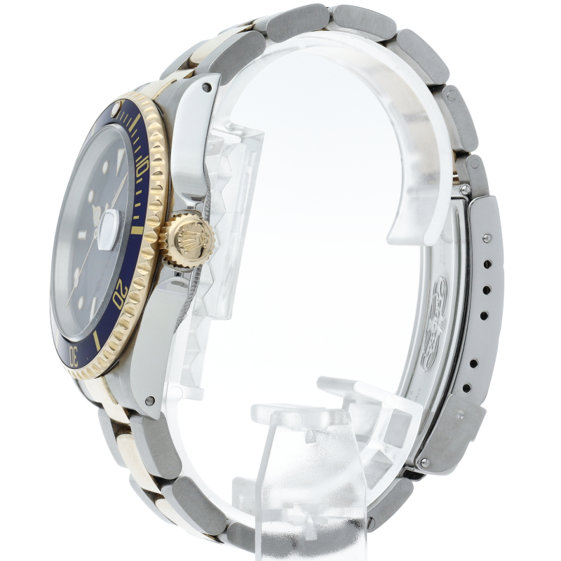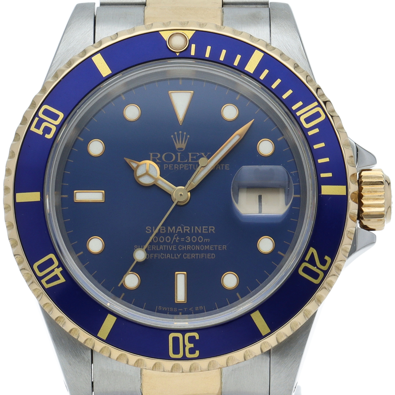 ロレックスの中でも特に人気度の高い「サブマリーナ・デイト」のイエローゴールドとステンレスのコンビモデルで高級感溢れる1本。通称「青サブ」。