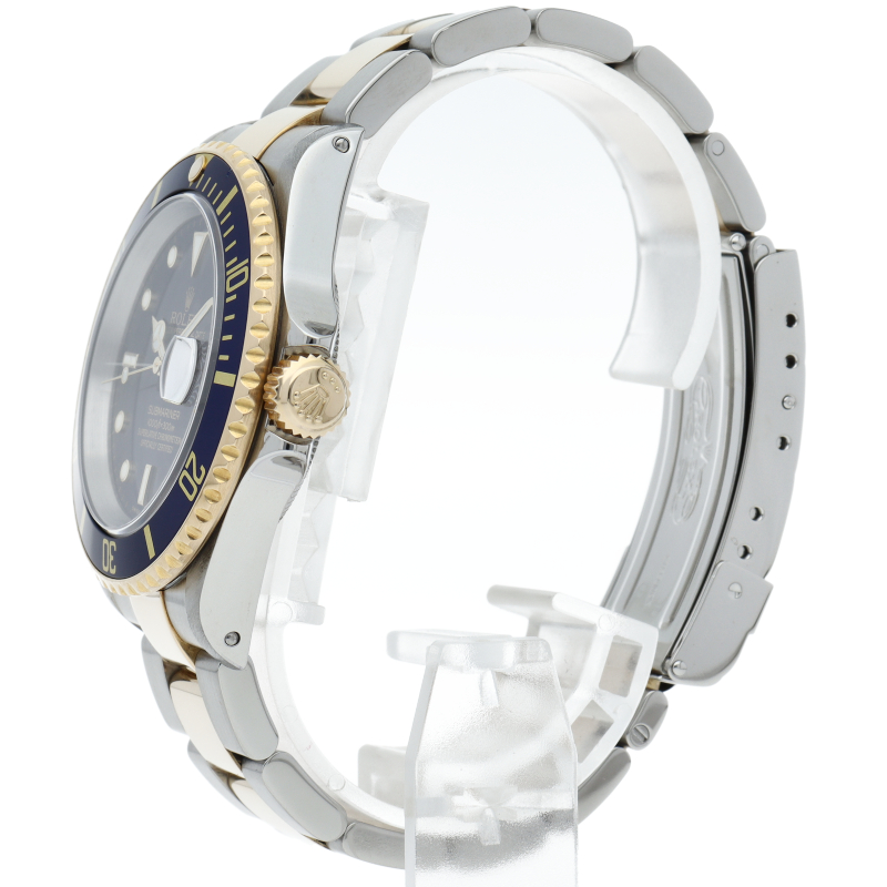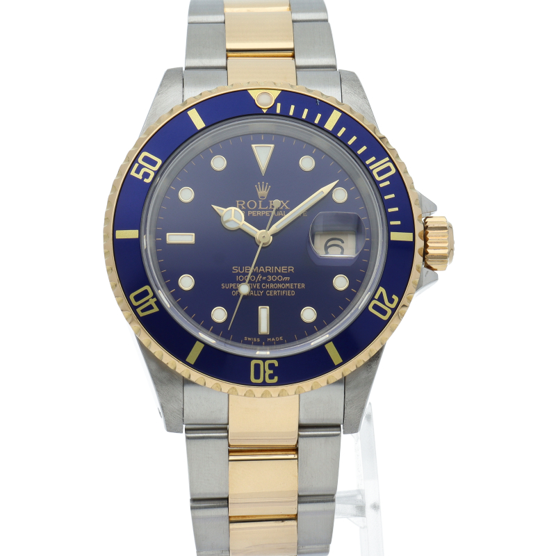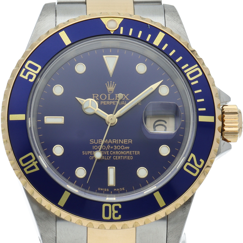 ロレックスの中でも特に人気度の高い「サブマリーナ・デイト」のイエローゴールドとステンレスのコンビモデルで高級感溢れる1本。通称「青サブ」。
