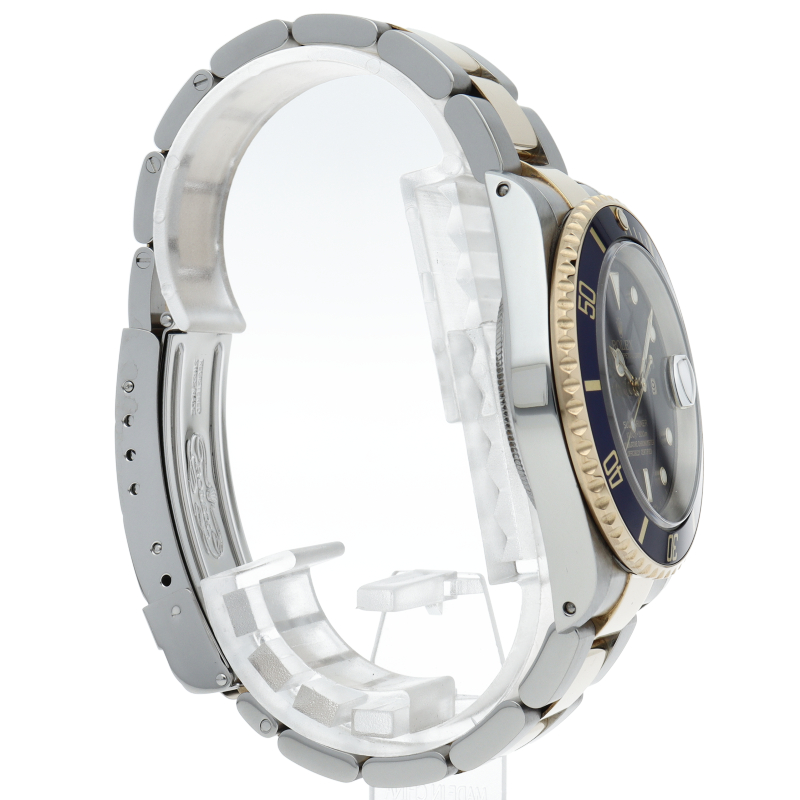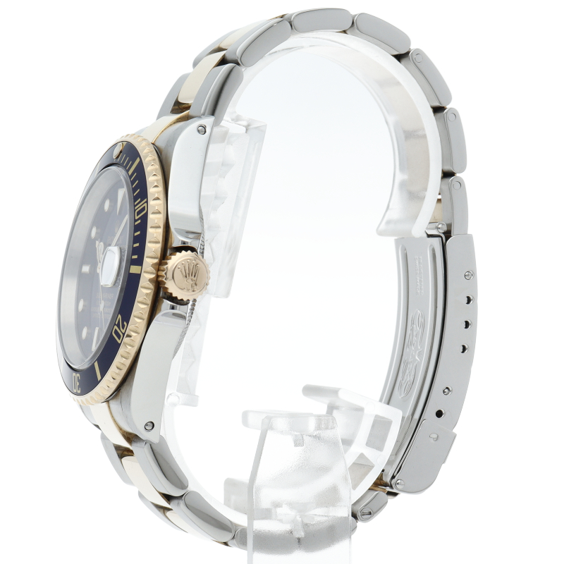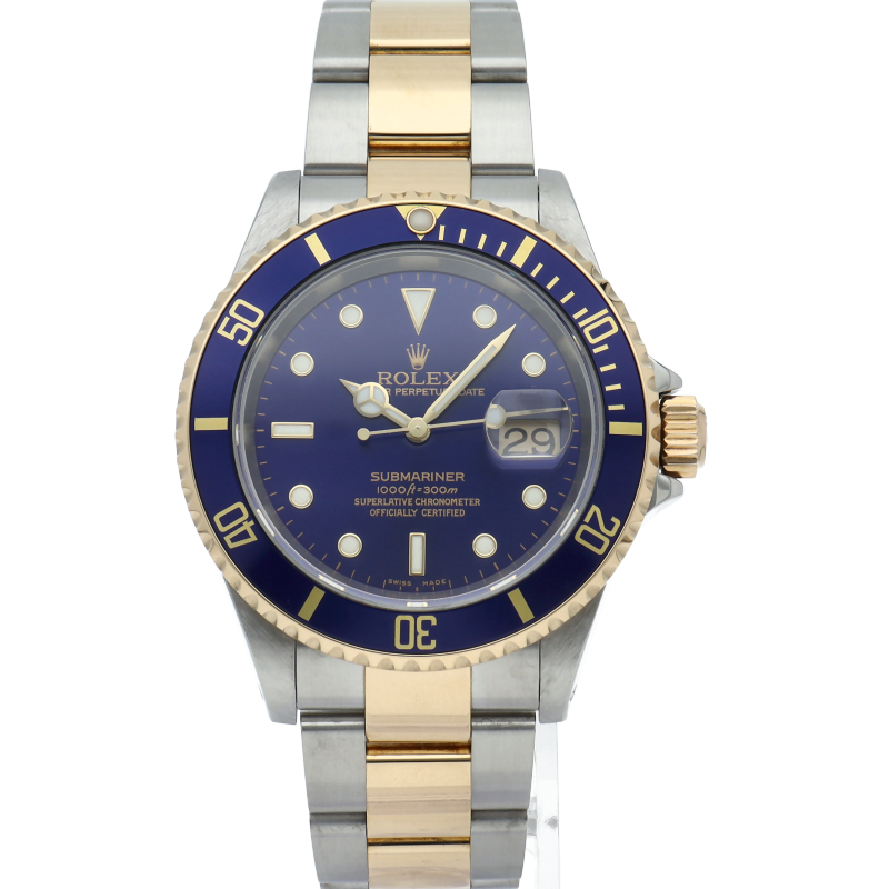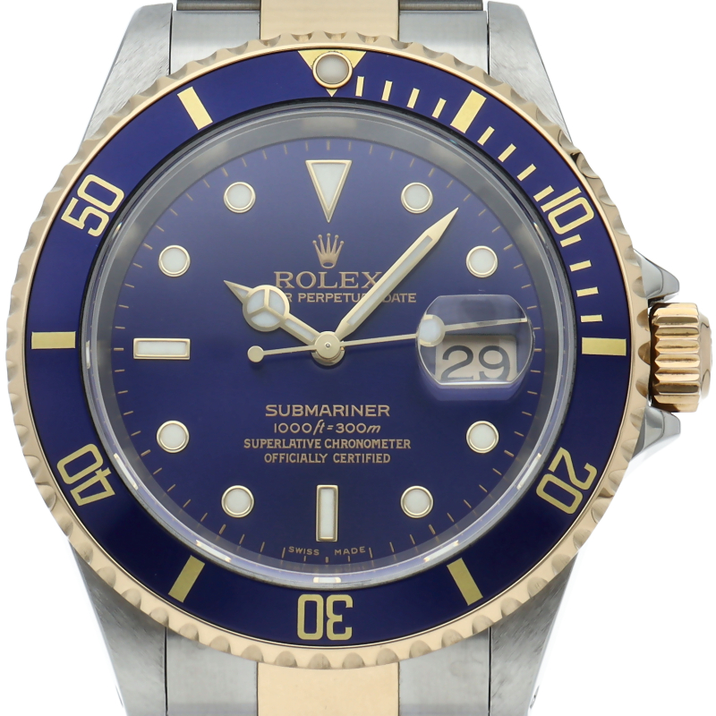 ロレックスの中でも特に人気度の高い「サブマリーナ・デイト」のイエローゴールドとステンレスのコンビモデルで高級感溢れる1本。通称「青サブ」。