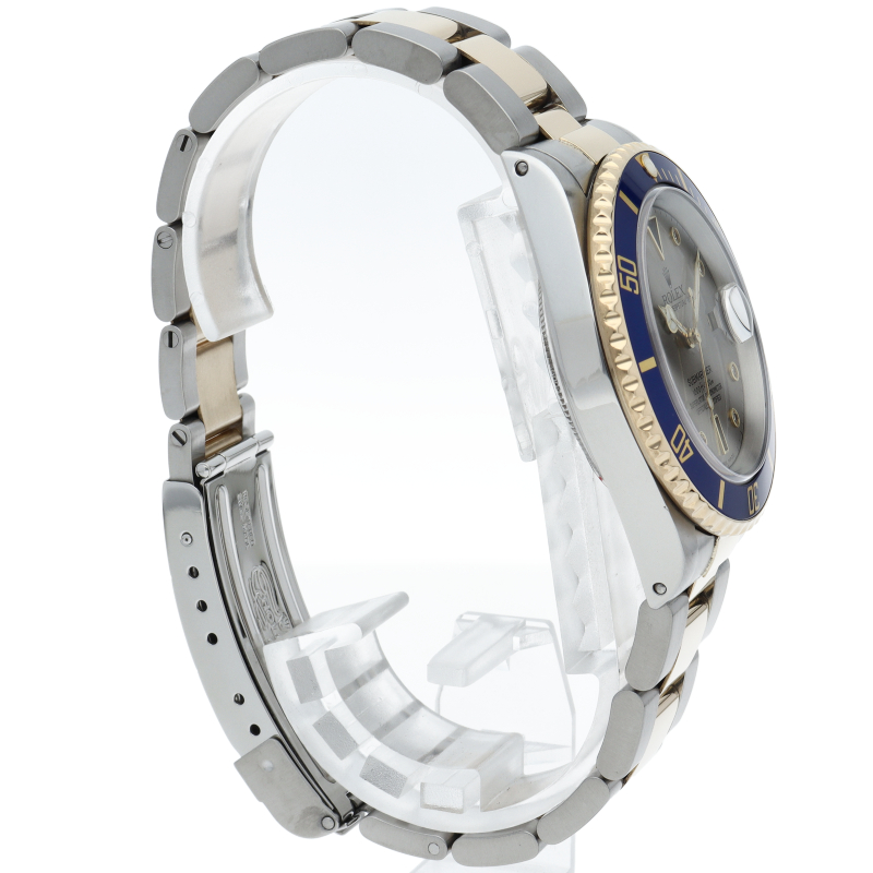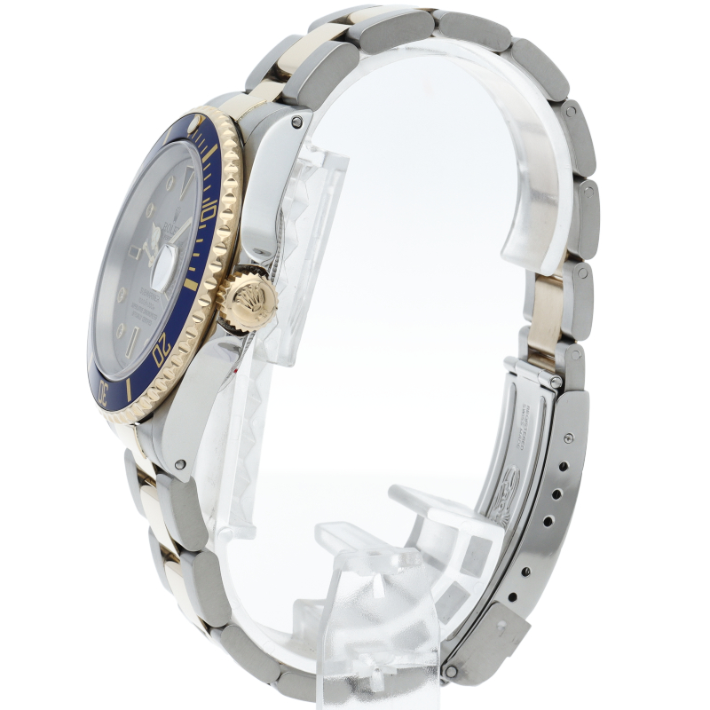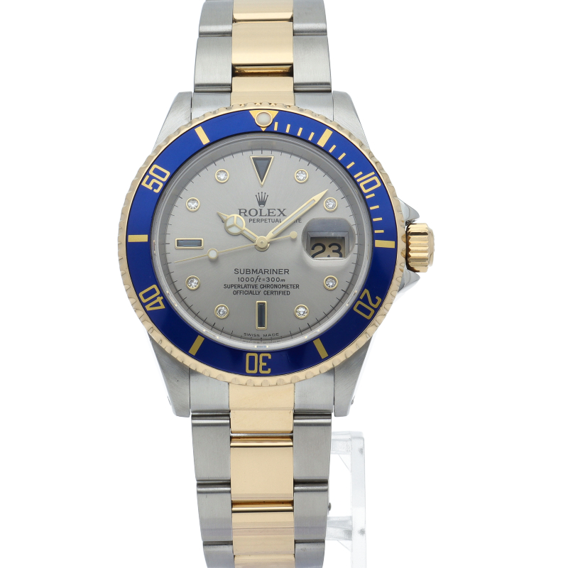 ロレックスの中でも特に人気度の高い「サブマリーナ・デイト」のイエローゴールドとステンレスのコンビモデルで文字盤に8Pダイヤ・3Pサファイアが施された高級感溢れる1本。