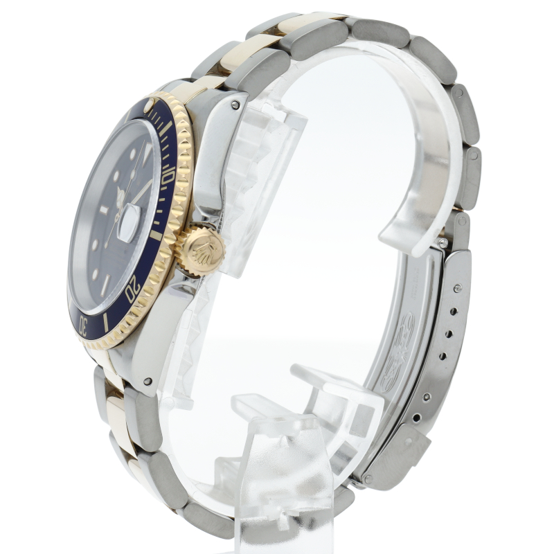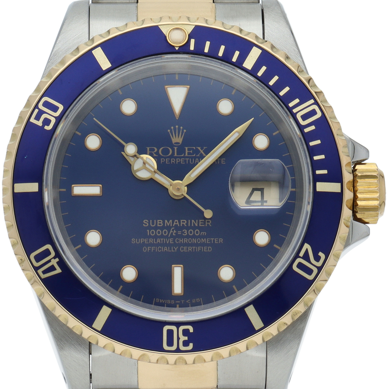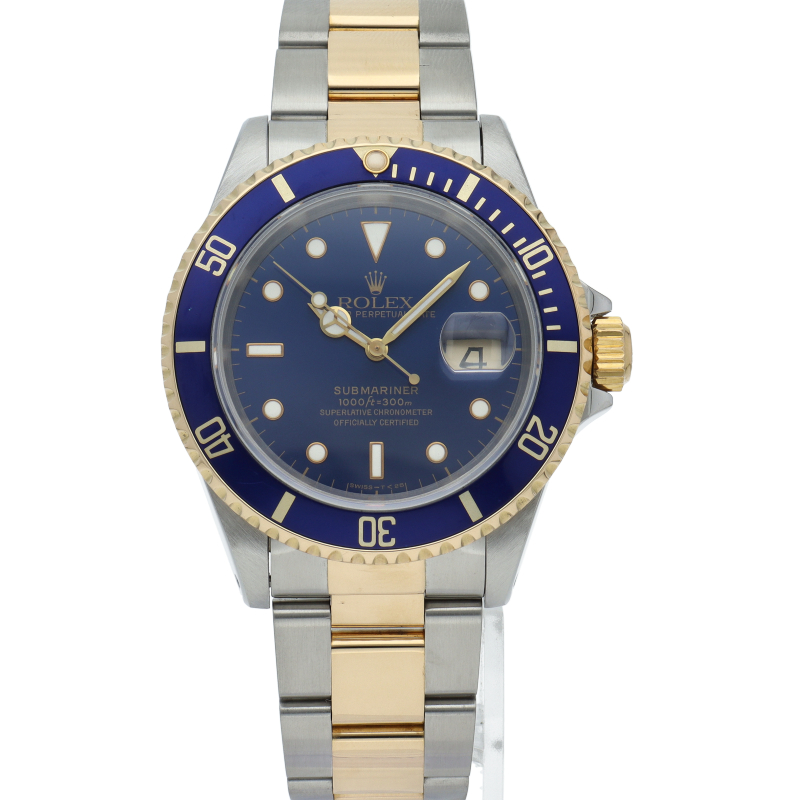 ロレックスの中でも特に人気度の高い「サブマリーナ・デイト」のイエローゴールドとステンレスのコンビモデルで高級感溢れる1本。通称「青サブ」。