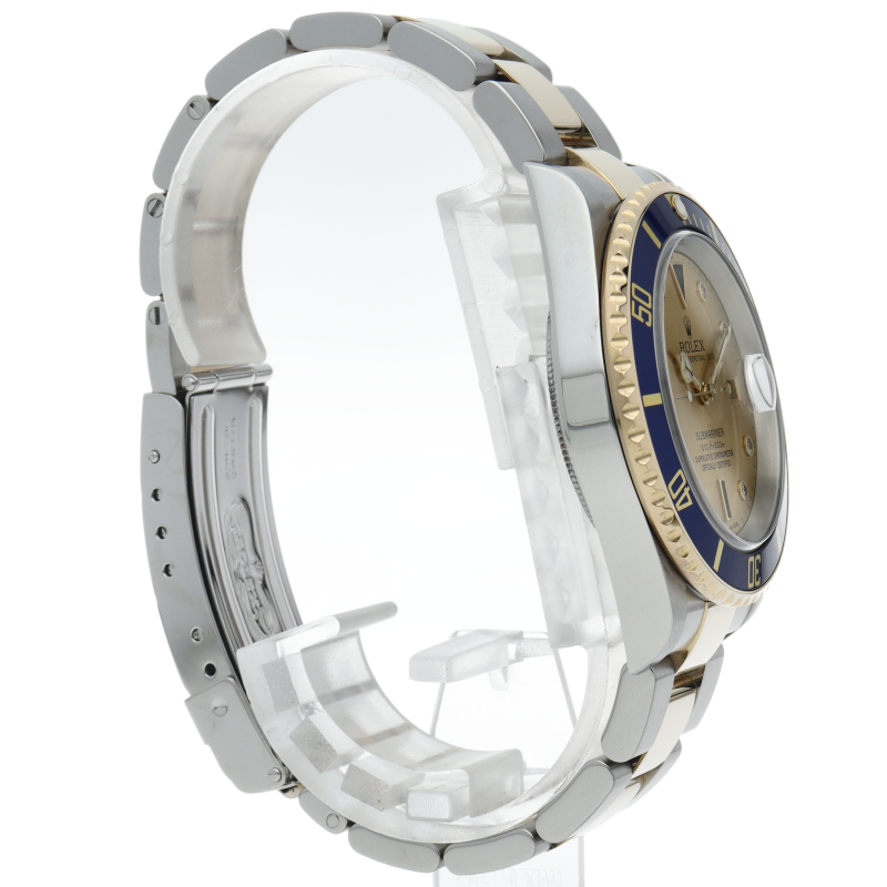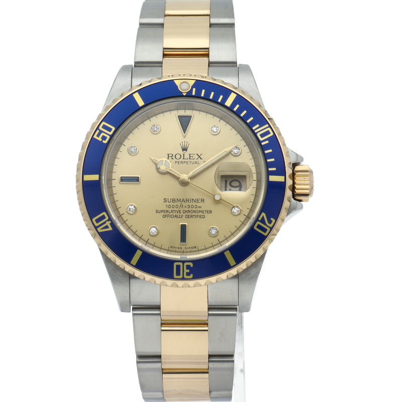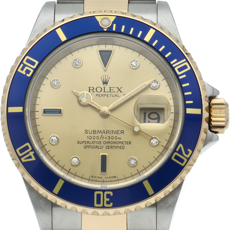 ロレックスの中でも特に人気度の高い「サブマリーナ・デイト」のイエローゴールドとステンレスのコンビモデルで文字盤に8Pダイヤ・3Pサファイアが施された高級感溢れる1本。