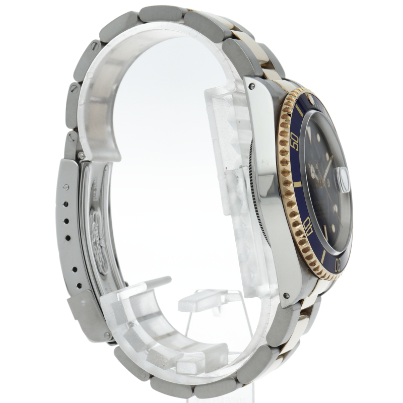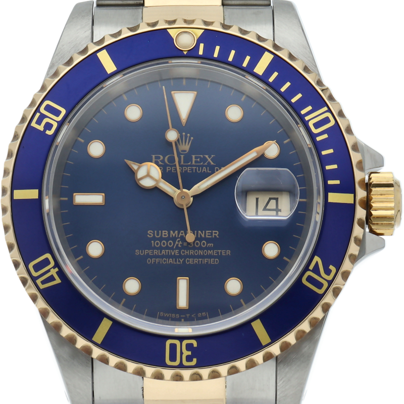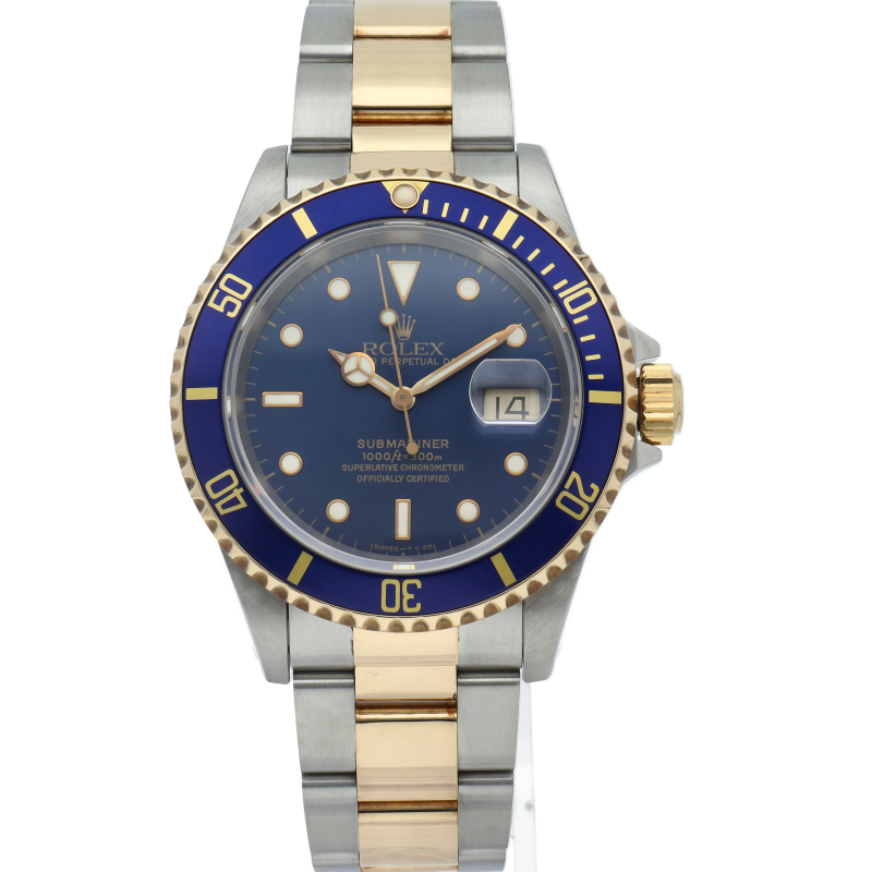 ロレックスの中でも特に人気度の高い「サブマリーナ・デイト」のイエローゴールドとステンレスのコンビモデルで高級感溢れる1本。通称「青サブ」。