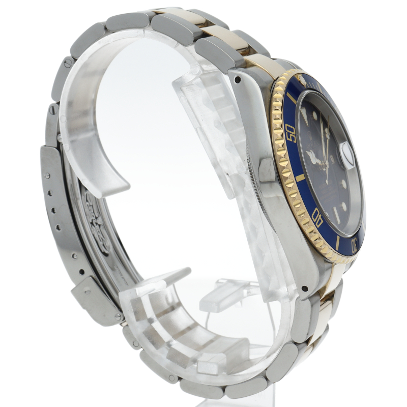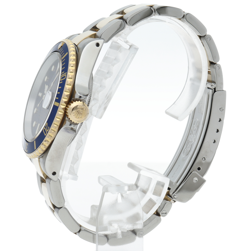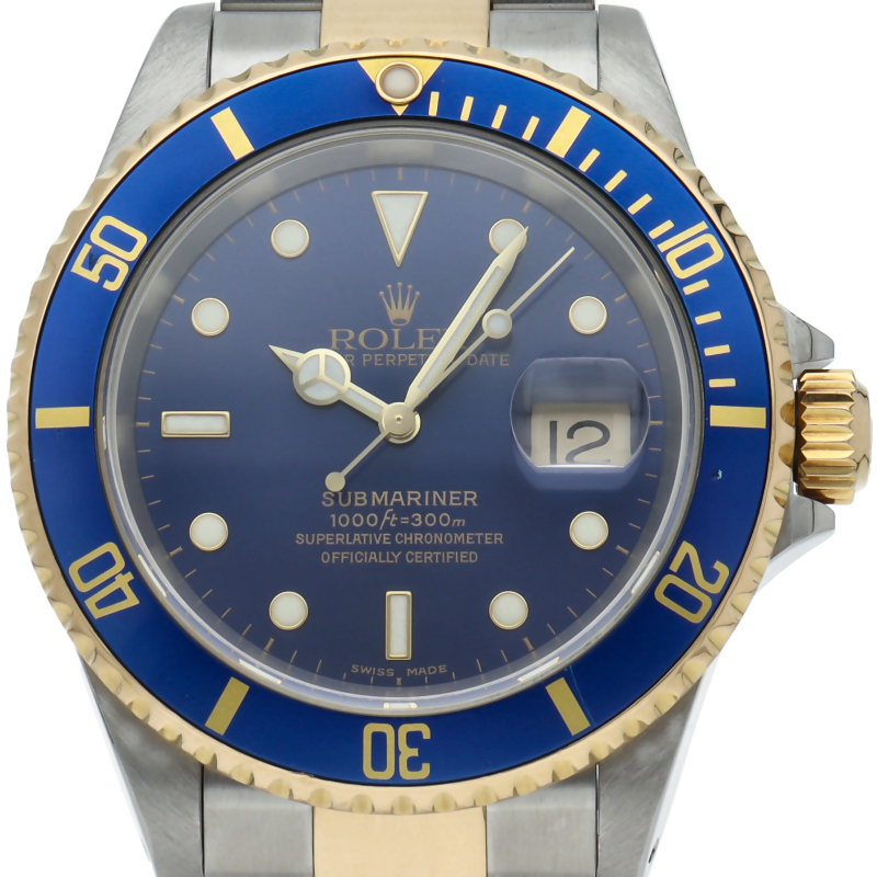 ロレックスの中でも特に人気度の高い「サブマリーナ・デイト」のイエローゴールドとステンレスのコンビモデルで高級感溢れる1本。通称「青サブ」。