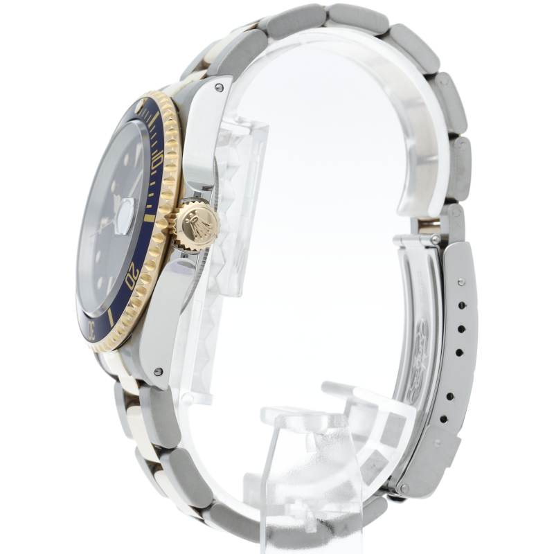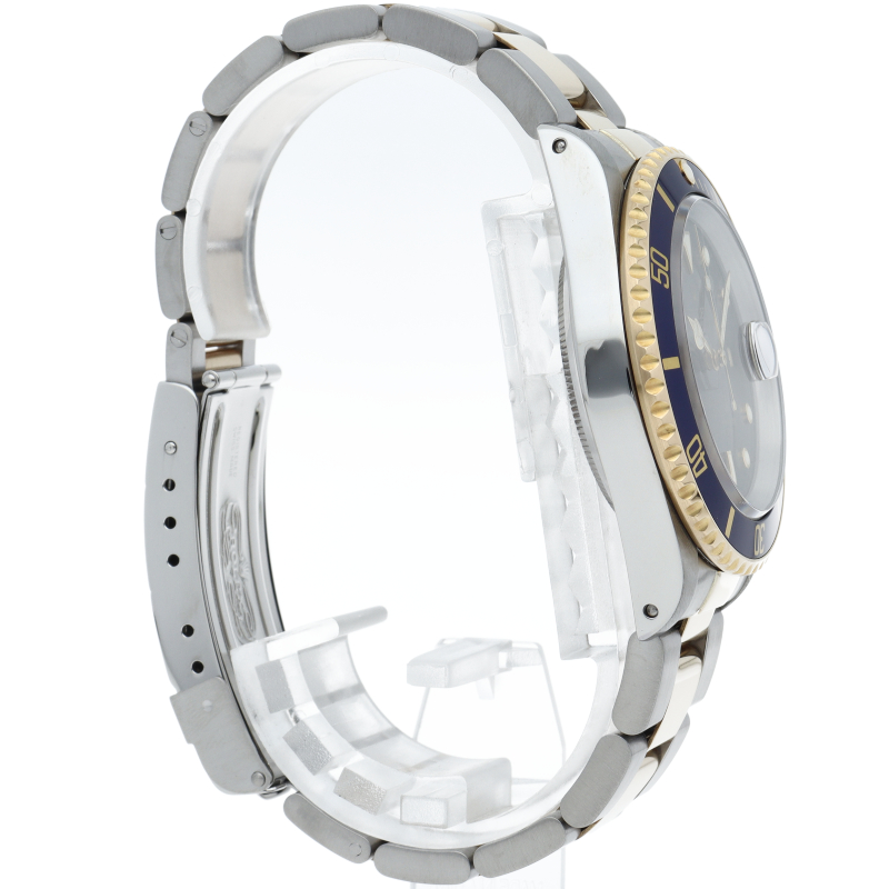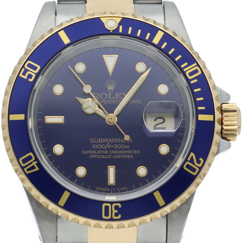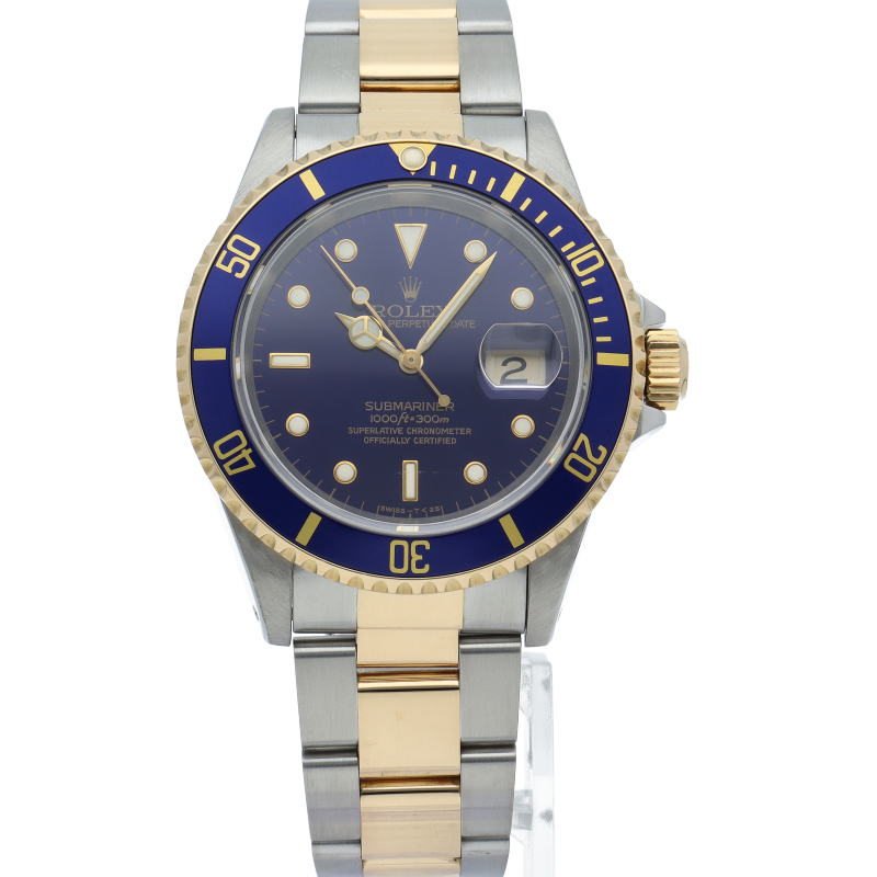ロレックスの中でも特に人気度の高い「サブマリーナ・デイト」のイエローゴールドとステンレスのコンビモデルで高級感溢れる1本。通称「青サブ」。