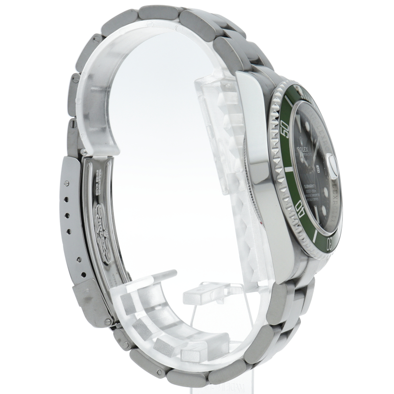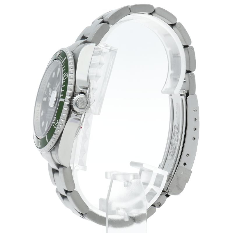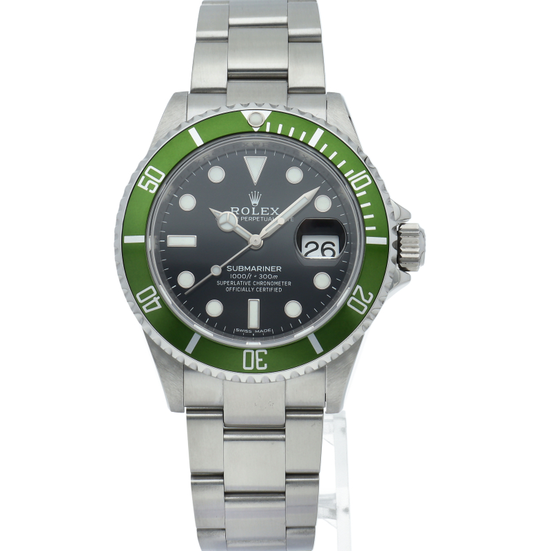 ロレックスの中でも特に人気度の高い「サブマリーナ・デイト」。グリーンベゼル仕様の通称「グリーンサブ」です。モデルチェンジに伴いこれからが楽しみな1本です。ベゼルはファット4ライムグリーンベゼルです。ロレックスにオーバーホールを出した際、ライムグリーンベゼルに変更されて戻ってきた希少な逸品です。
