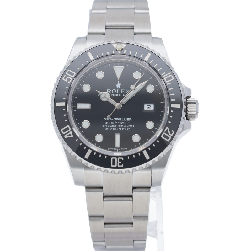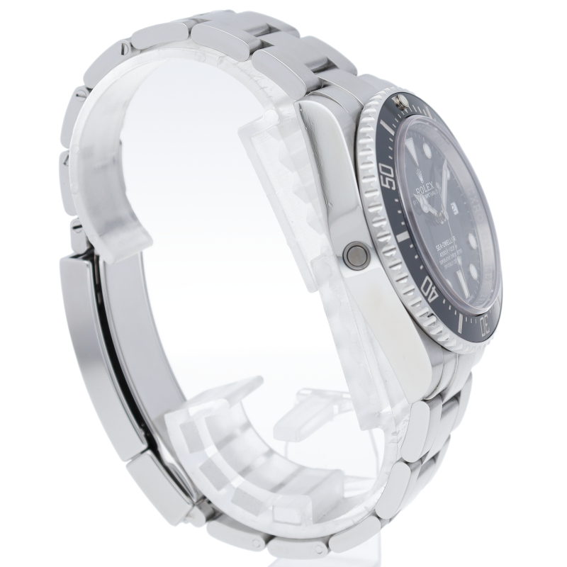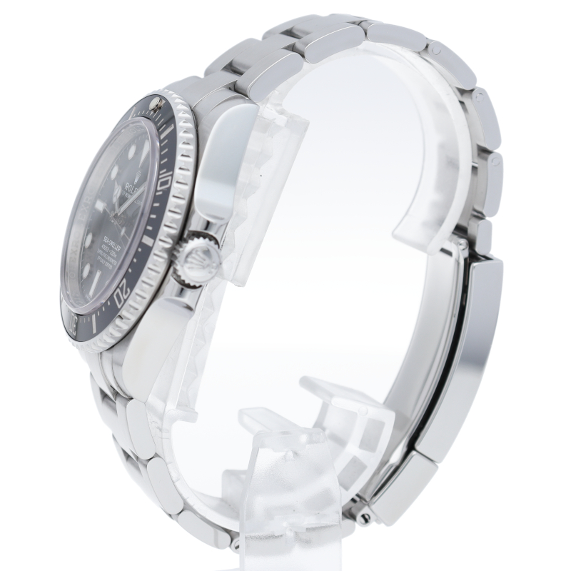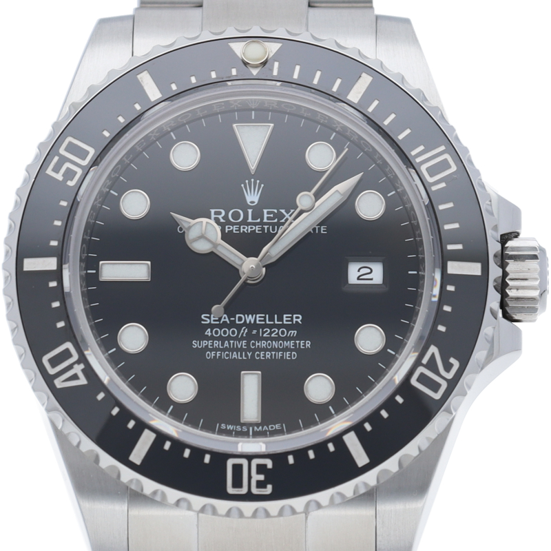 ディープシーのケースサイズ43mmから40mmに少しサイズダウンしてサブマリーナと同じサイズになりましたが、耐性に優れたセラクロム逆回転防止ベゼル、ブレスレットの微調整が容易なグライドロックエクステンションシステム、長時間発光するクロマライトインデックスなどの革新的な最新技術が搭載されたプロ仕様のダイバーズウォッチに仕上げられています。