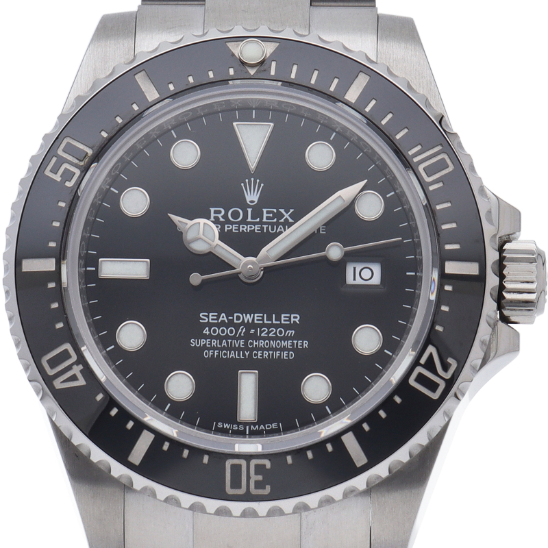 ディープシーのケースサイズ43mmから40mmに少しサイズダウンしてサブマリーナと同じサイズになりましたが、耐性に優れたセラクロム逆回転防止ベゼル、ブレスレットの微調整が容易なグライドロックエクステンションシステム、長時間発光するクロマライトインデックスなどの革新的な最新技術が搭載されたプロ仕様のダイバーズウォッチに仕上げられています。