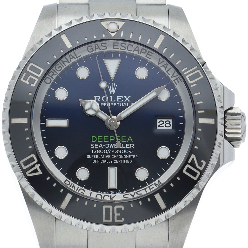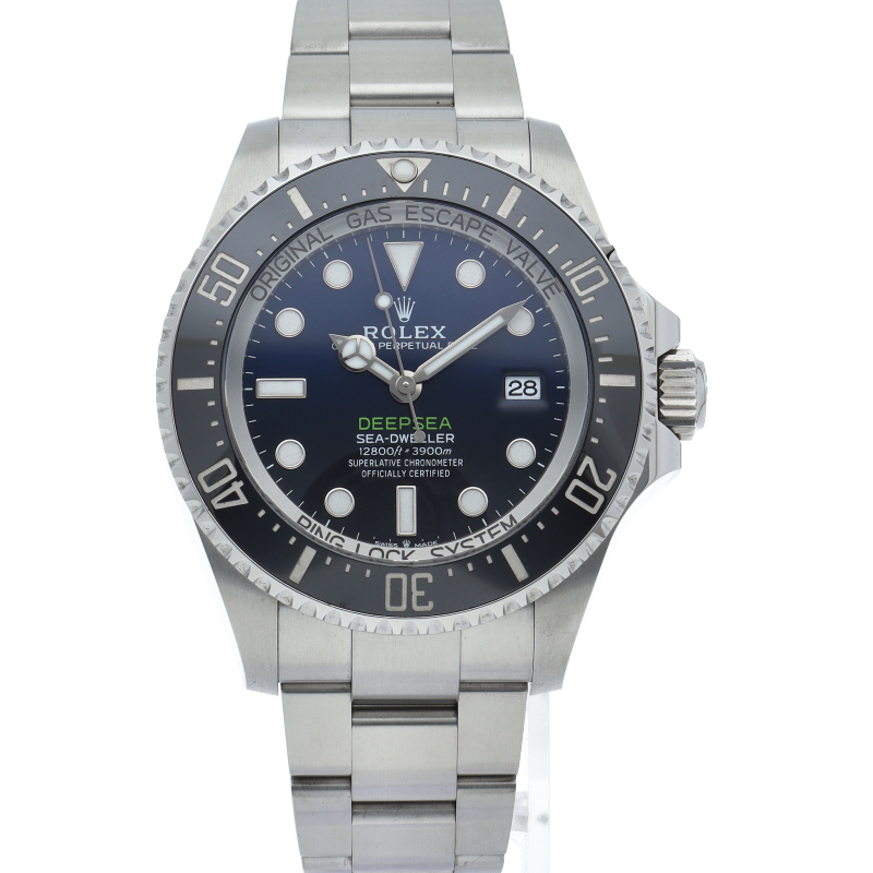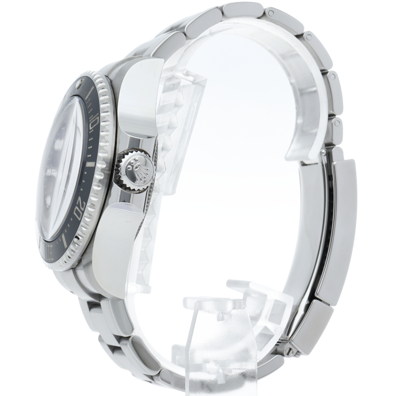 クロノメーター認定のモデルです。44mmの大型ケースと3900mの圧倒的な防水性能が特徴で、前作に続き強力な圧力にも耐える事が出来る“リングロックシステム”を搭載しております。ケースサイドにはヘリウムエスケープバルブを備え、ベゼルは耐傷性に優れたセラミック製です。バックルにはロレックス独自の“グライドロックエクステンションシステム”を備え、工具無しで長さの微調整が可能です。