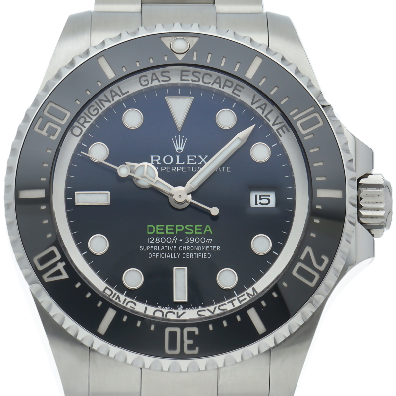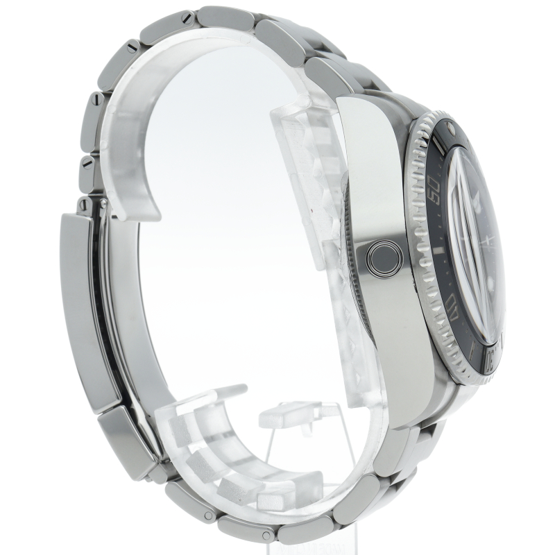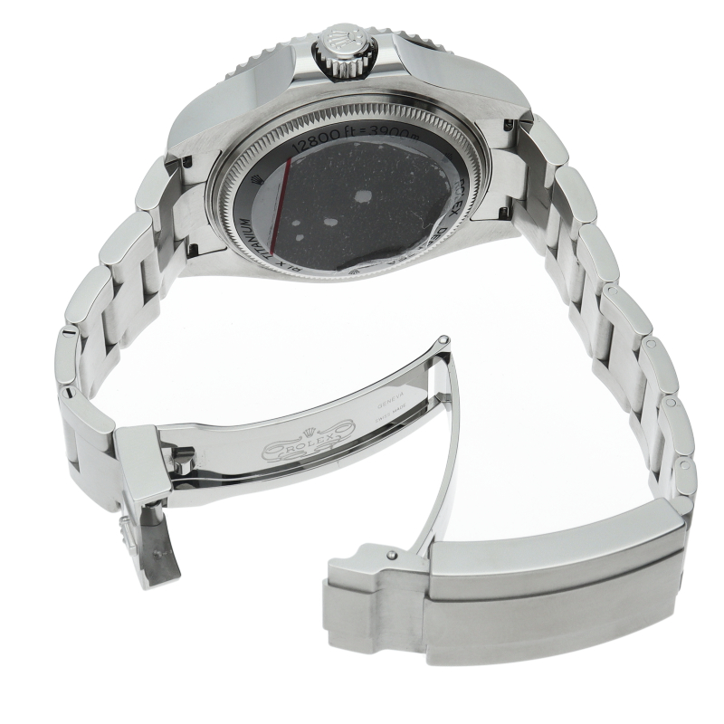 クロノメーター認定のモデルです。44mmの大型ケースと3900mの圧倒的な防水性能が特徴で、前作に続き強力な圧力にも耐える事が出来る“リングロックシステム”を搭載しております。ケースサイドにはヘリウムエスケープバルブを備え、ベゼルは耐傷性に優れたセラミック製です。バックルにはロレックス独自の“グライドロックエクステンションシステム”を備え、工具無しで長さの微調整が可能です。