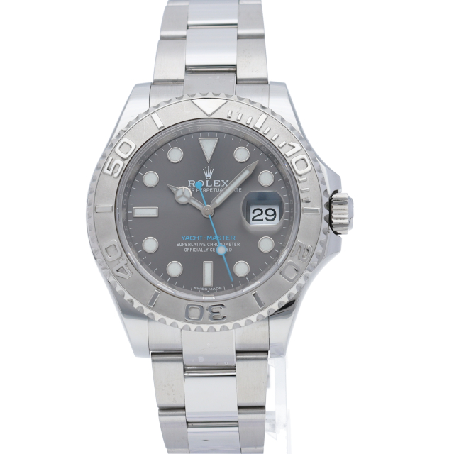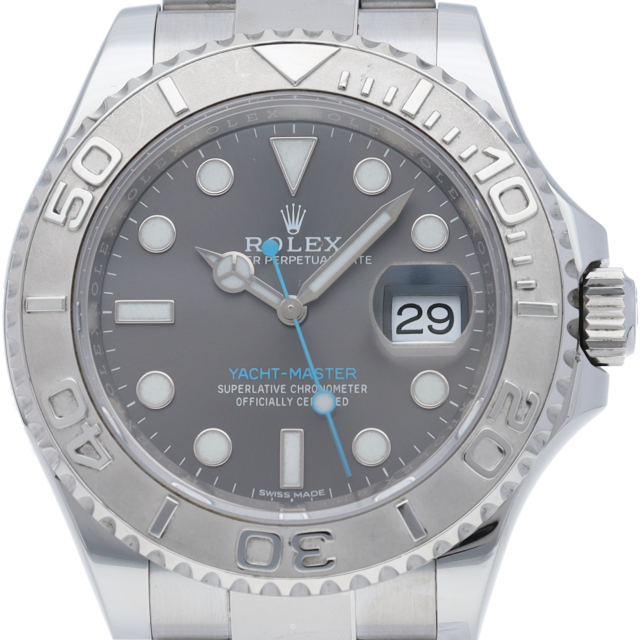ワンランク上のスポーツモデル「ヨットマスター」。搭載されている自社製ムーブメントには、ロレックスが5年間を費やして開発したパラクロムヒゲゼンマイを採用。ドットのインデックスには青白い発光をするクロマライト塗料となりました。またオイスターロッククラスプを採用することで高級感が向上しています。