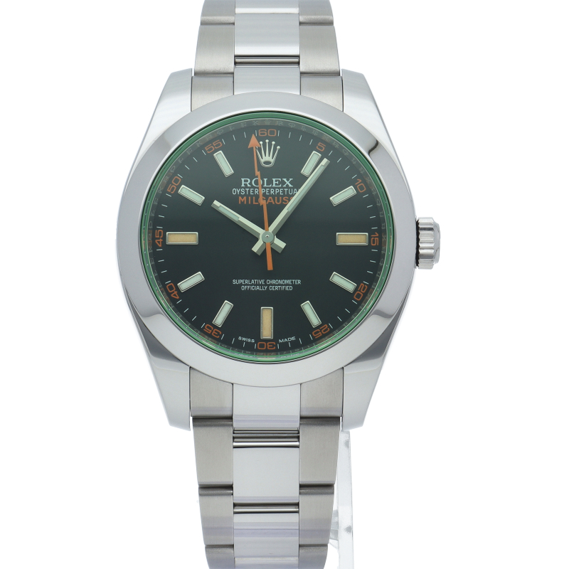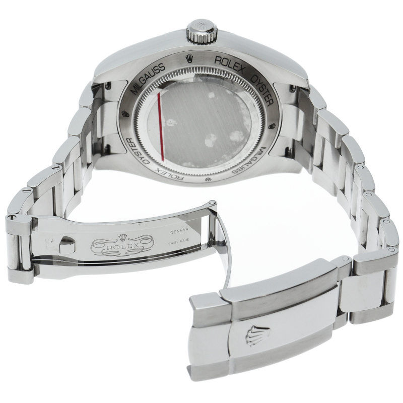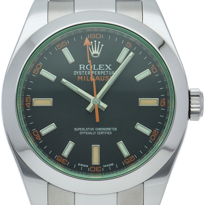 科学者のために生まれた高耐磁時計ミルガウス「116400GV」。最大の特徴であるグリーンサファイア風防と、アイコニックなオレンジの稲妻針が、知性と遊び心を同時に演出します。2023年の生産終了により市場価値が急上昇中。他モデルにはない独創的なデザインで、コレクター心をくすぐる至高の一本です。
