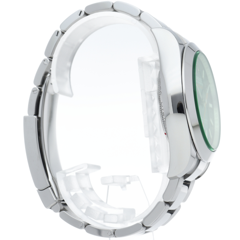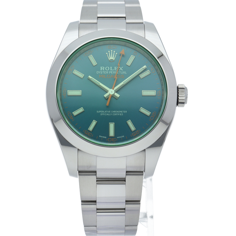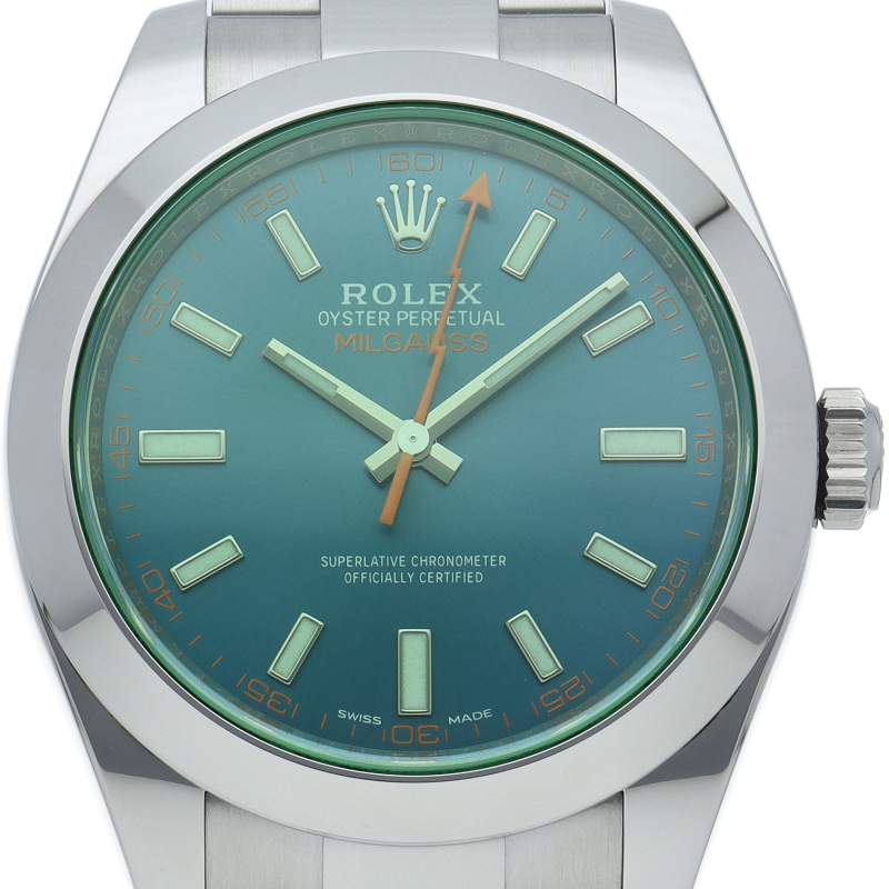 科学者のために生まれた高耐磁時計ミルガウス「116400GV」。最大の特徴であるグリーンサファイア風防と、アイコニックなオレンジの稲妻針が、知性と遊び心を同時に演出します。2023年の生産終了により市場価値が急上昇中。他モデルにはない独創的なデザインで、コレクター心をくすぐる至高の一本です。