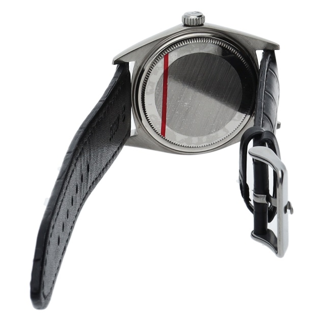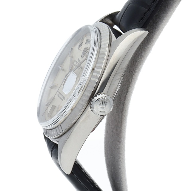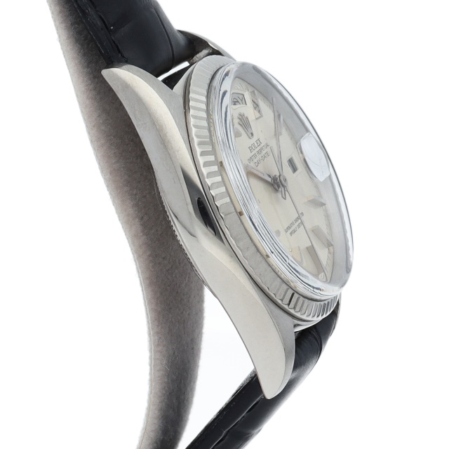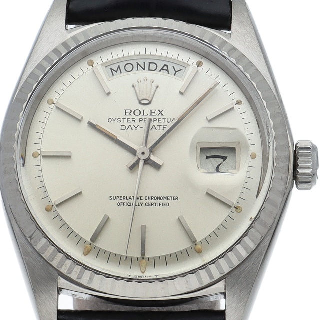 ロレックスの最高機種デイデイトのアンティークモデルです。文字盤は定番のシルバーで、黒の革ベルトとの相性が抜群です。