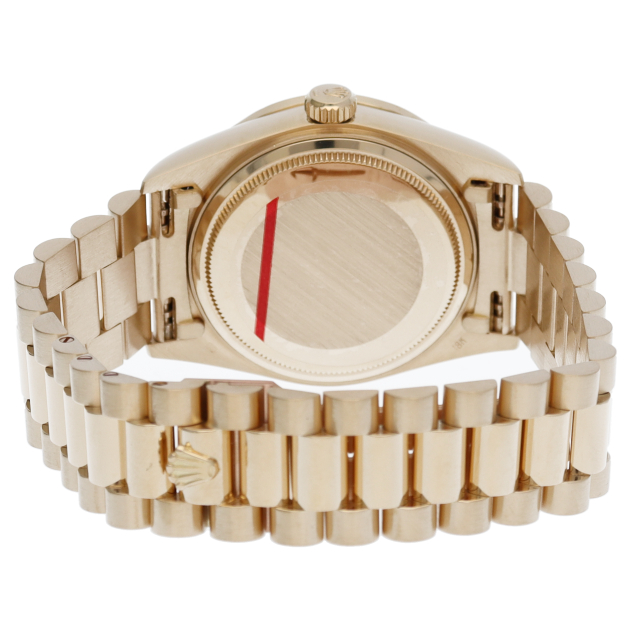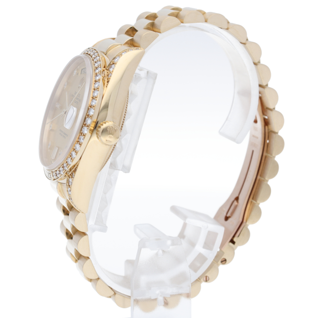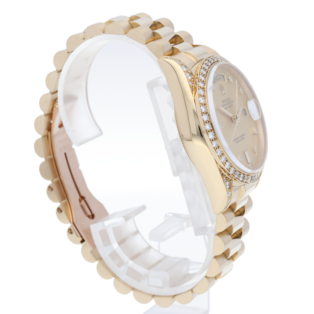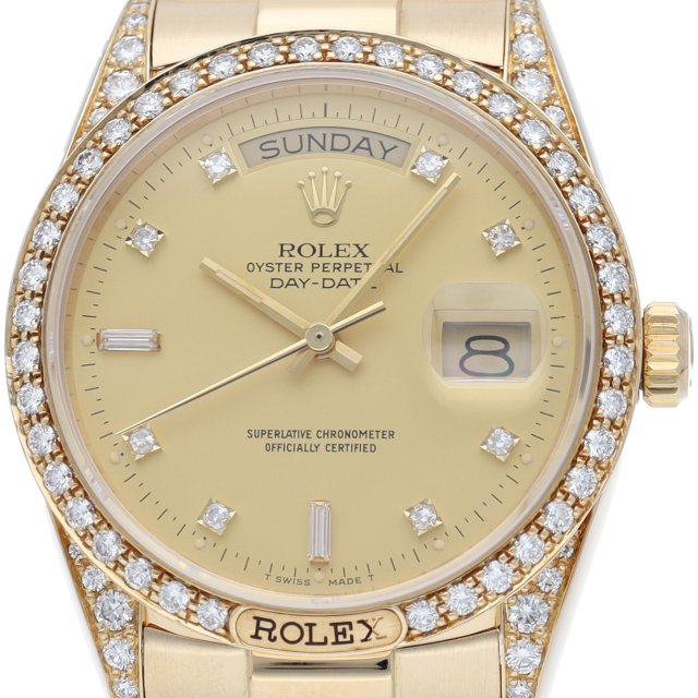 ロレックスのドレスウォッチの最高峰「デイデイト」。イエローゴールドを贅沢に使用し、ベゼルとラグに純正ダイヤを使用した贅沢な逸品です。