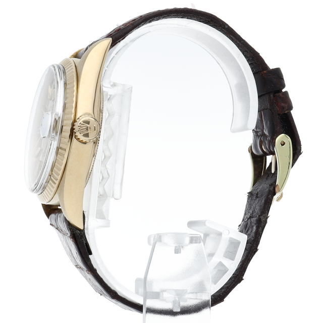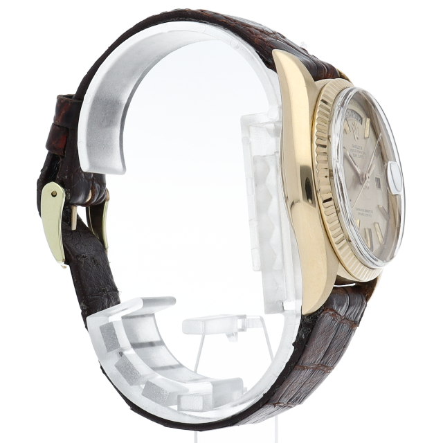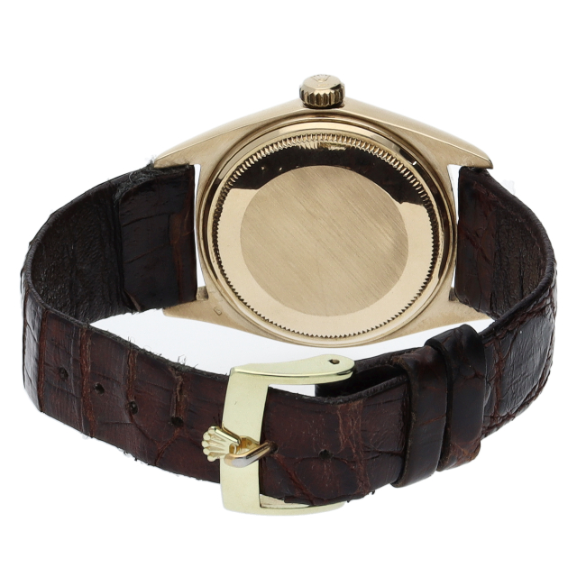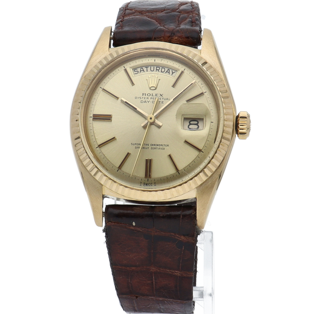 ロレックスの最高機種デイデイトのアンティークモデルです。文字盤は定番のシャンパンゴールドで、茶色の革ベルトとの相性が抜群です。