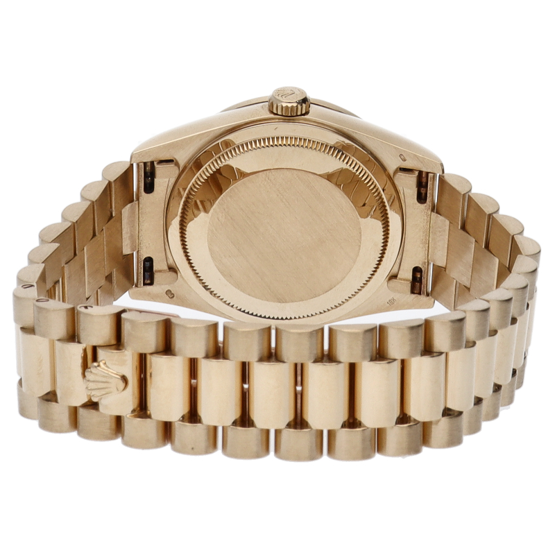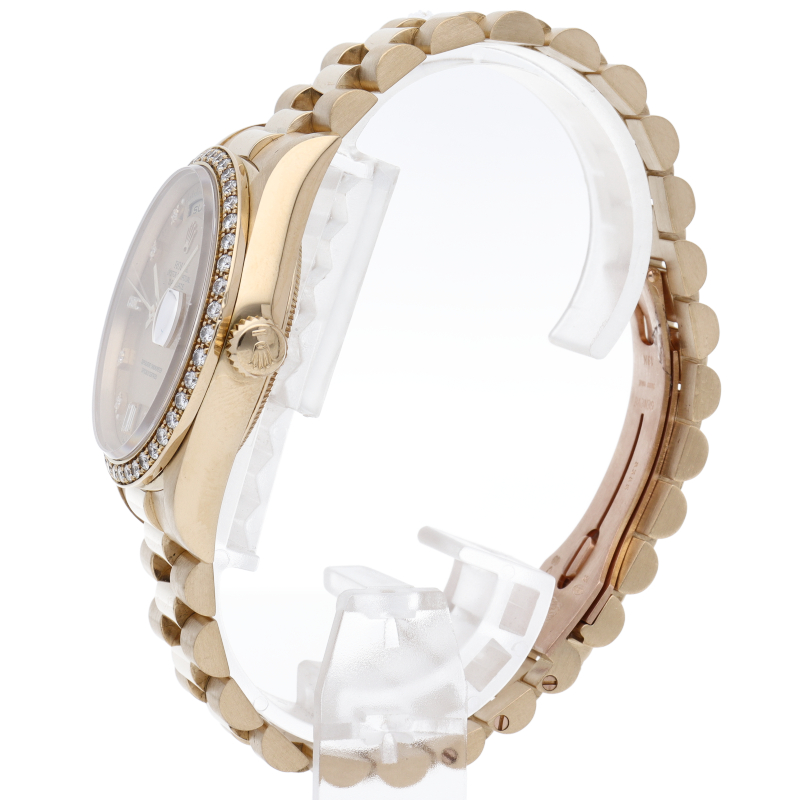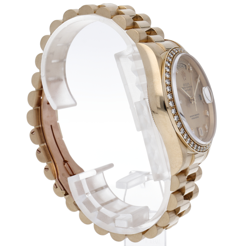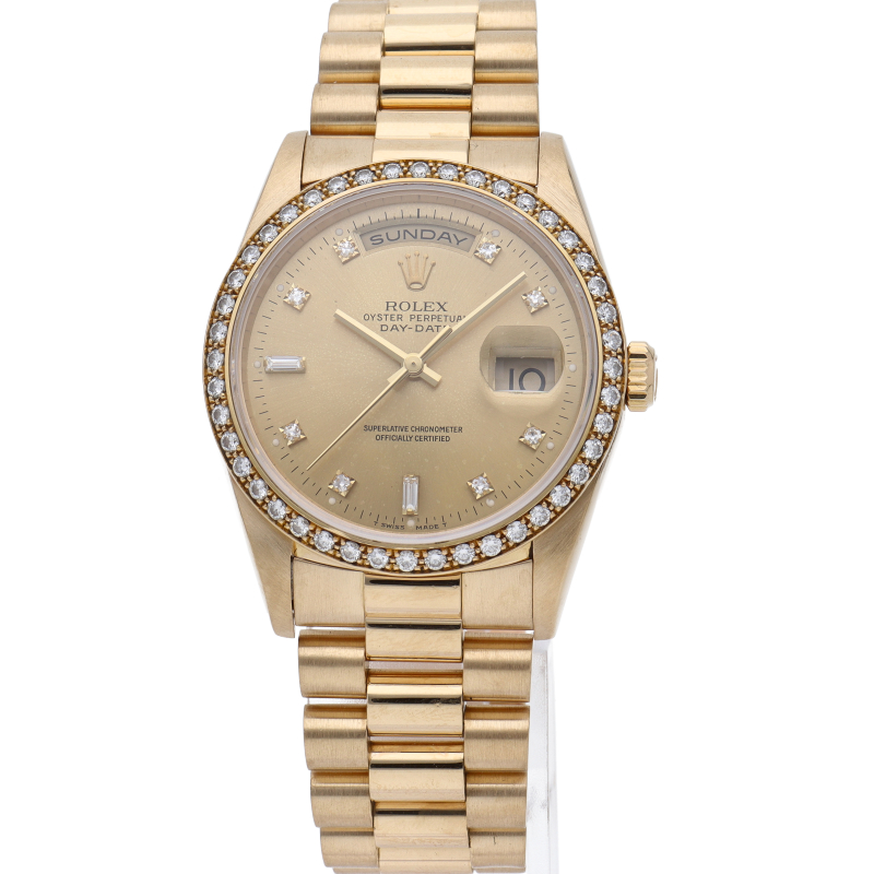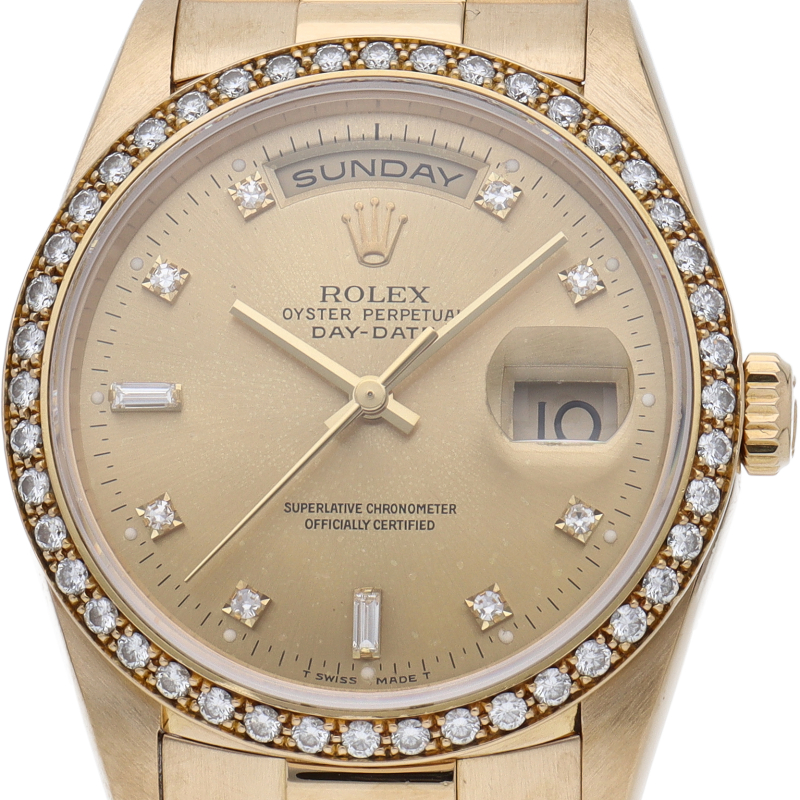 ロレックスのドレスウォッチの最高峰「デイデイト」。イエローゴールドを贅沢に使用した高級感溢れるステータスウォッチです。ベゼルにもダイヤモンドが施された最高級品です。