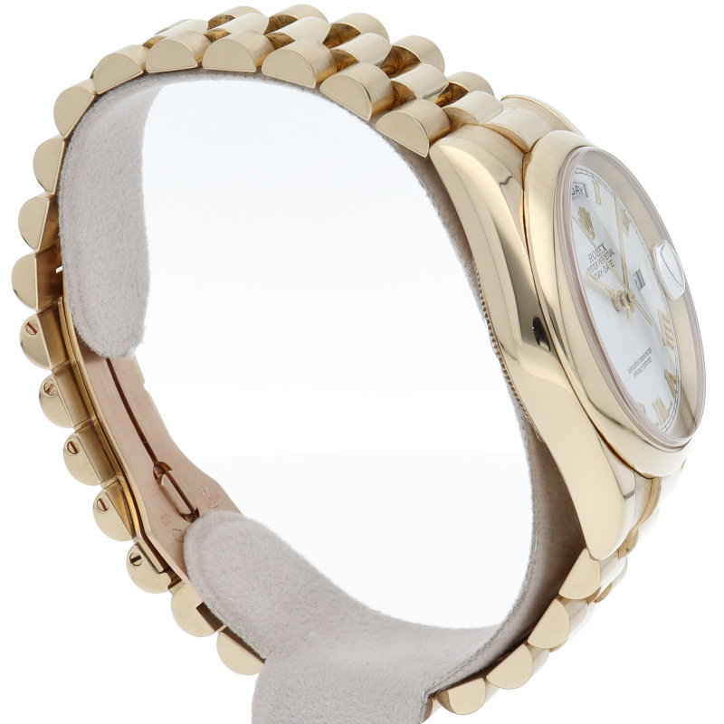 ロレックスのドレスウォッチの最高峰「デイデイト」。上品なイエローゴールドを贅沢に使用した高級感溢れるステータスウォッチです。