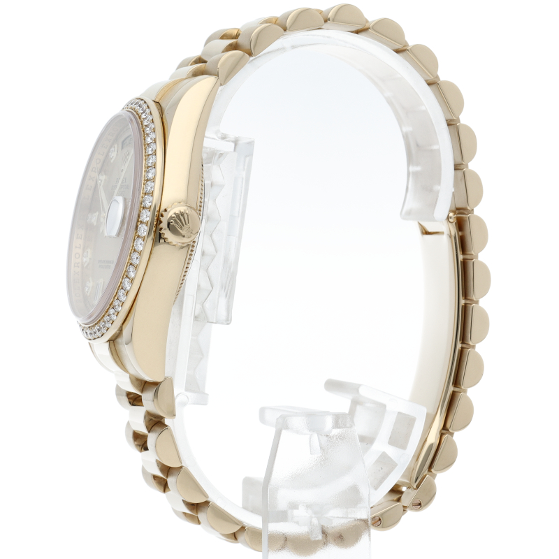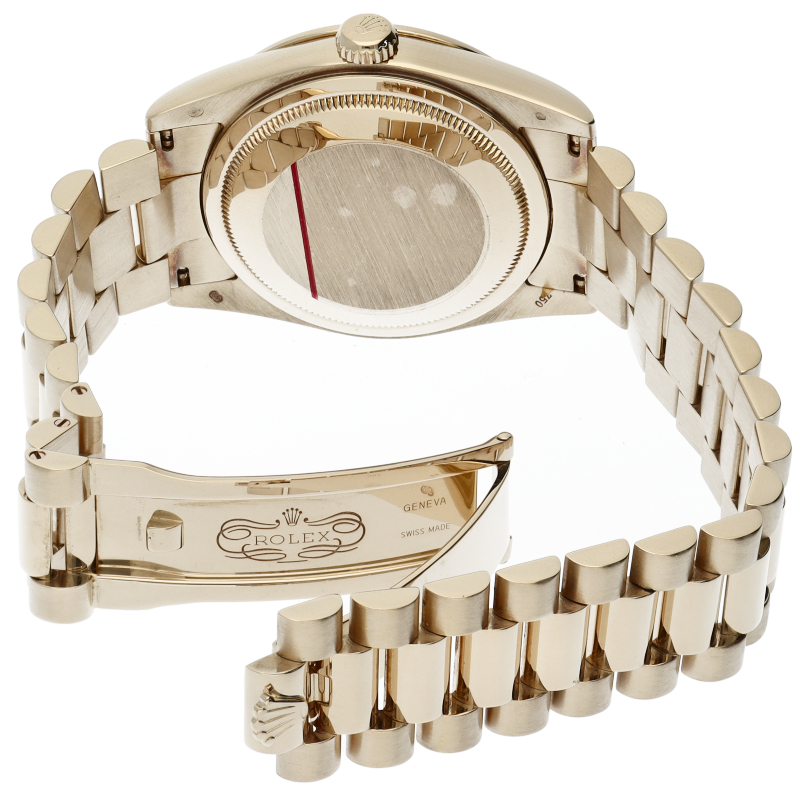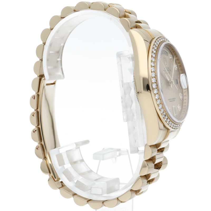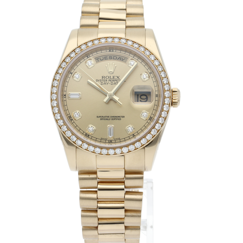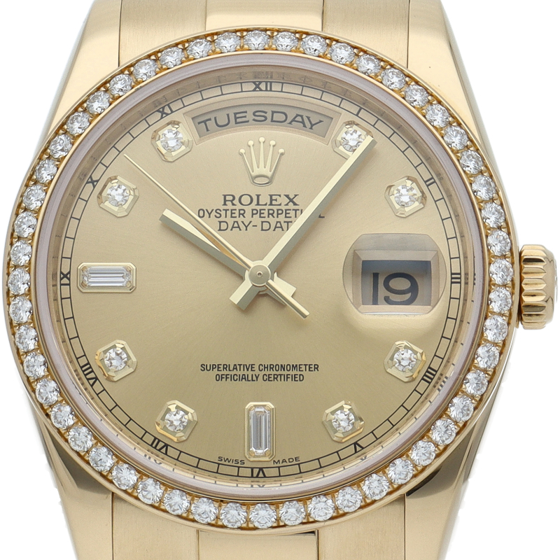 ロレックスのドレスウォッチの最高峰「デイデイト」。イエローゴールドを贅沢に使用、ベゼルにはダイヤモンドを施したした高級感溢れるステータスウォッチです。