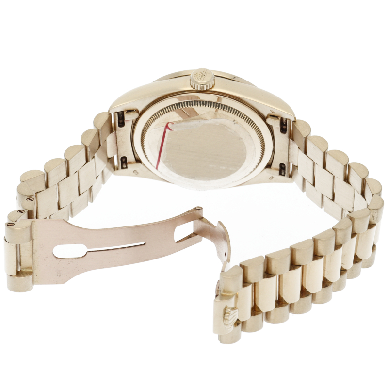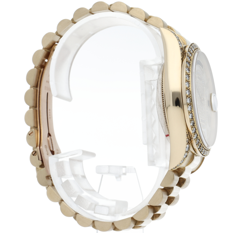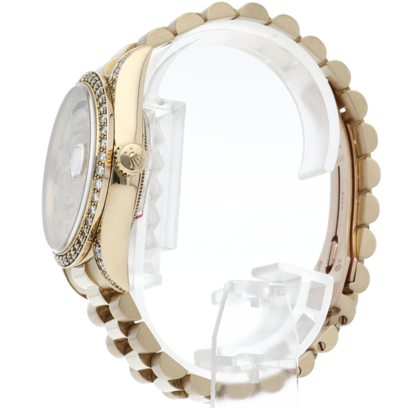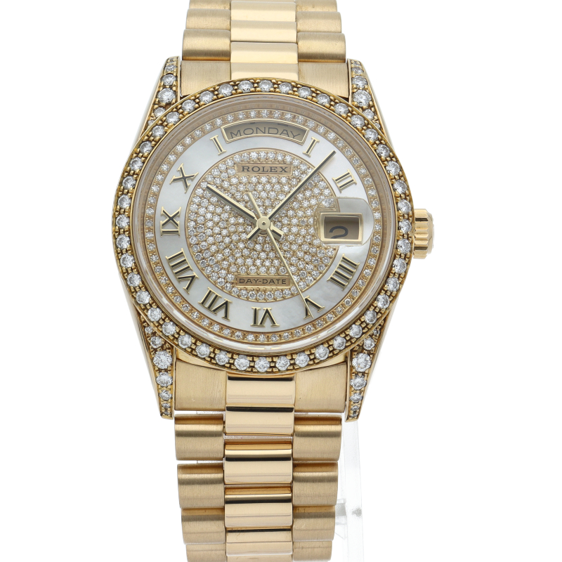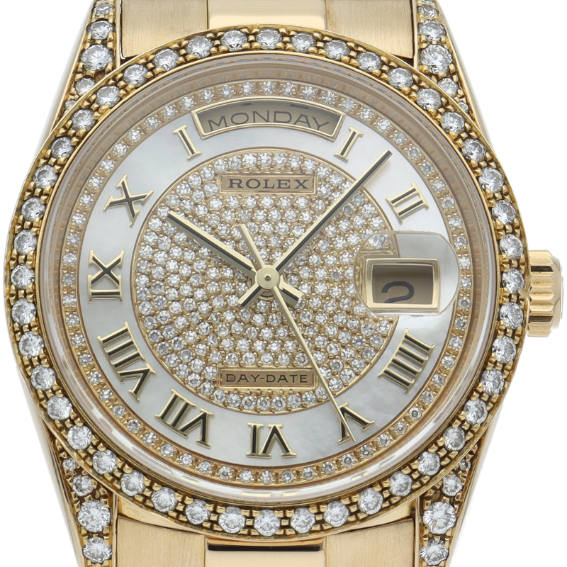 ロレックスのドレスウォッチの最高峰「デイデイト」。イエローゴールドを贅沢に使用し、ベゼルとラグ、文字盤に純正ダイヤを使用した贅沢な逸品です。